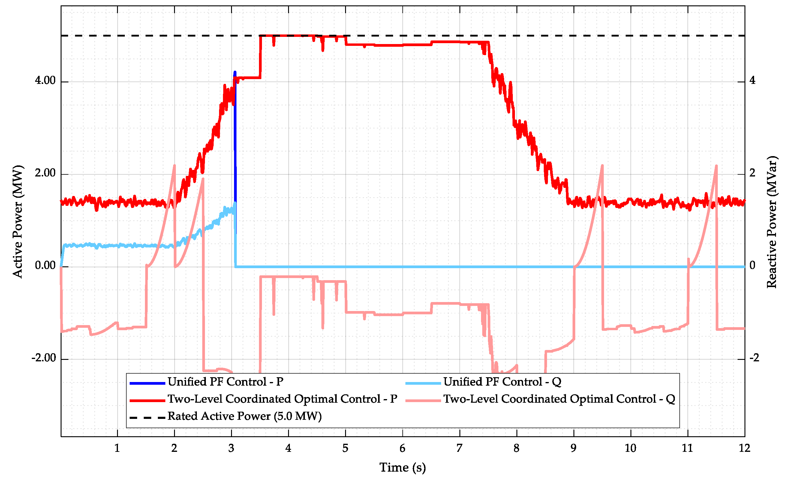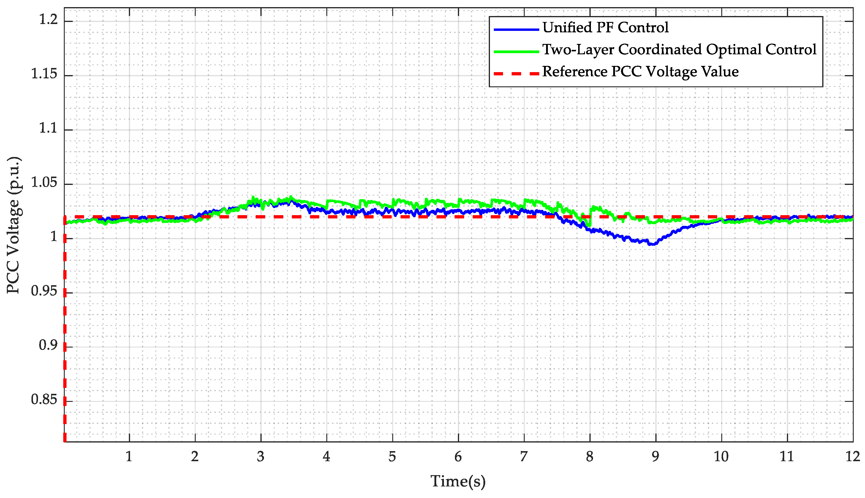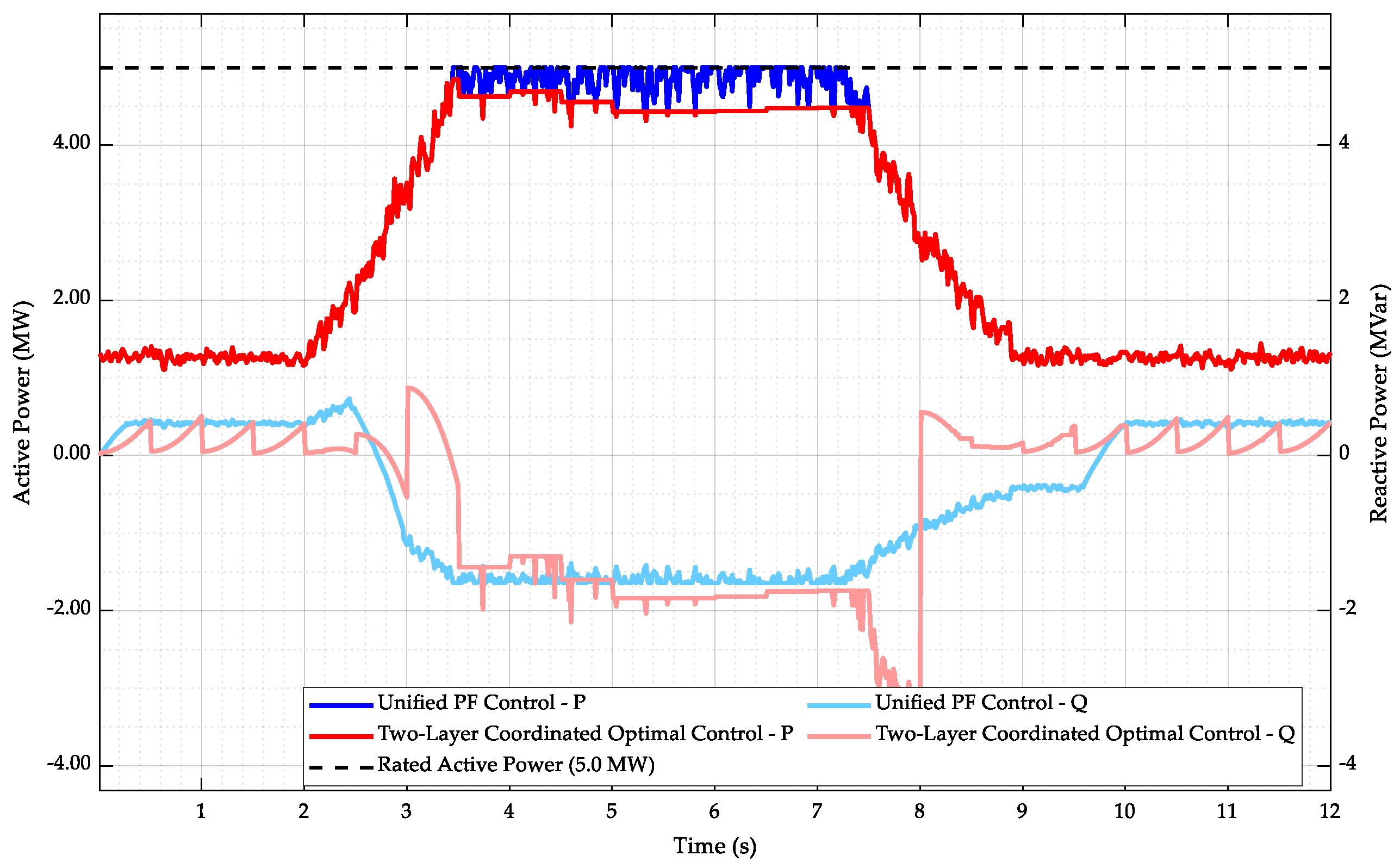 Therefore, changes in wind speed will cause fluctuations in the active power output of the wind farm. The impact of these fluctuations on the voltage at the point of common coupling (PCC) is not only related to the impedance of the transmission line but also to the operating power factor of the wind farm. By promptly adjusting the operating power factor and increasing or decreasing the reactive power output, fluctuations in the voltage at the point of common coupling (PCC) can be effectively suppressed.