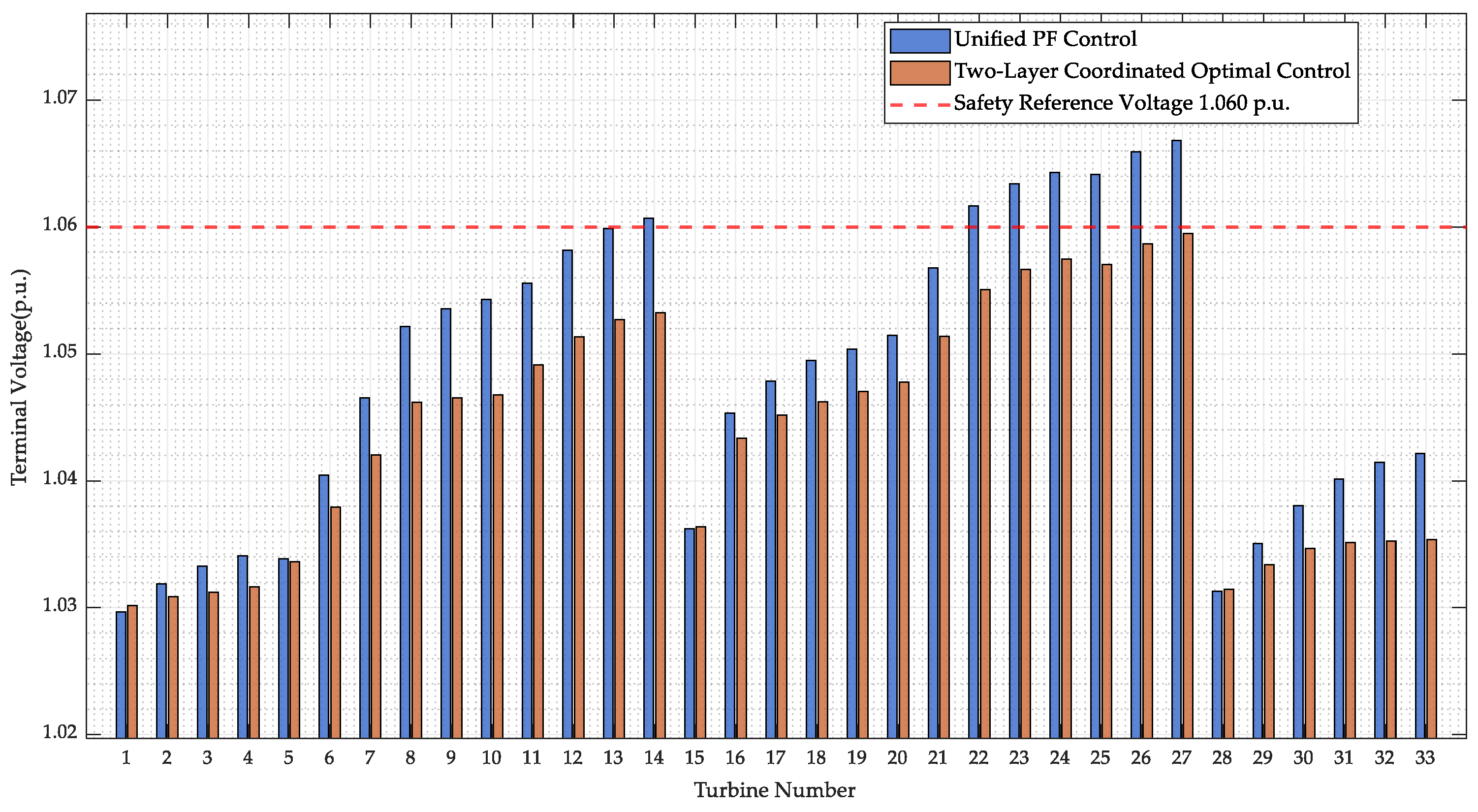 19]. This results in a gradual increase in the voltage distribution at the nodes of the wind turbine units from the beginning to the end of the feeder. When the wind farm participates in providing auxiliary voltage support to the system, even if the voltage at the PCC is maintained within the target range, some turbine units at the end of the feeders within the farm may still experience high voltage limits. This can cause these units to either malfunction or trigger high-voltage protection actions, leading to their disconnection from the grid, thereby compromising the safe operation of the system [
