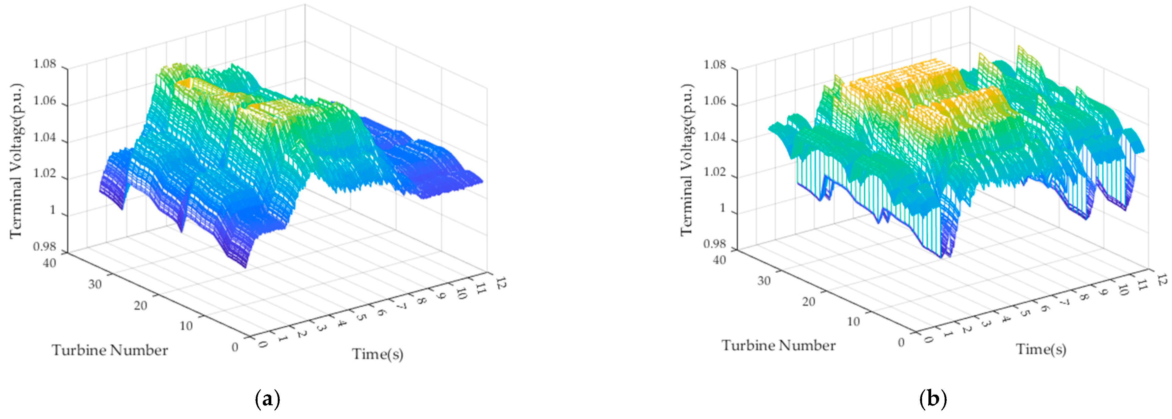 Next, the variation pattern of the terminal voltage of wind turbine units is analyzed. Based on the PCC voltage of the wind farm, the expression for the terminal voltage of each turbine unit can also be derived as follows: