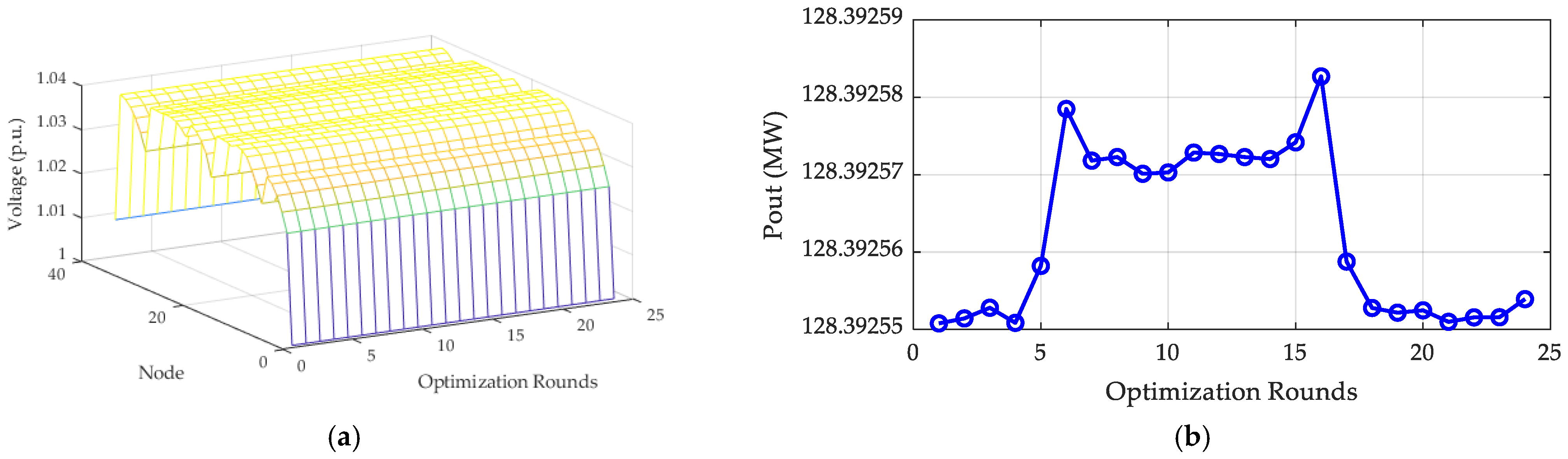 Therefore, this paper proposes a two-layer optimization. First, the per-unit PCC voltage is initialized to 1 and set as the root node voltage in the wind farm’s second-order cone optimization model to solve for the optimal active/reactive power output of the wind turbines and the corresponding terminal voltages. This yields the active power output P