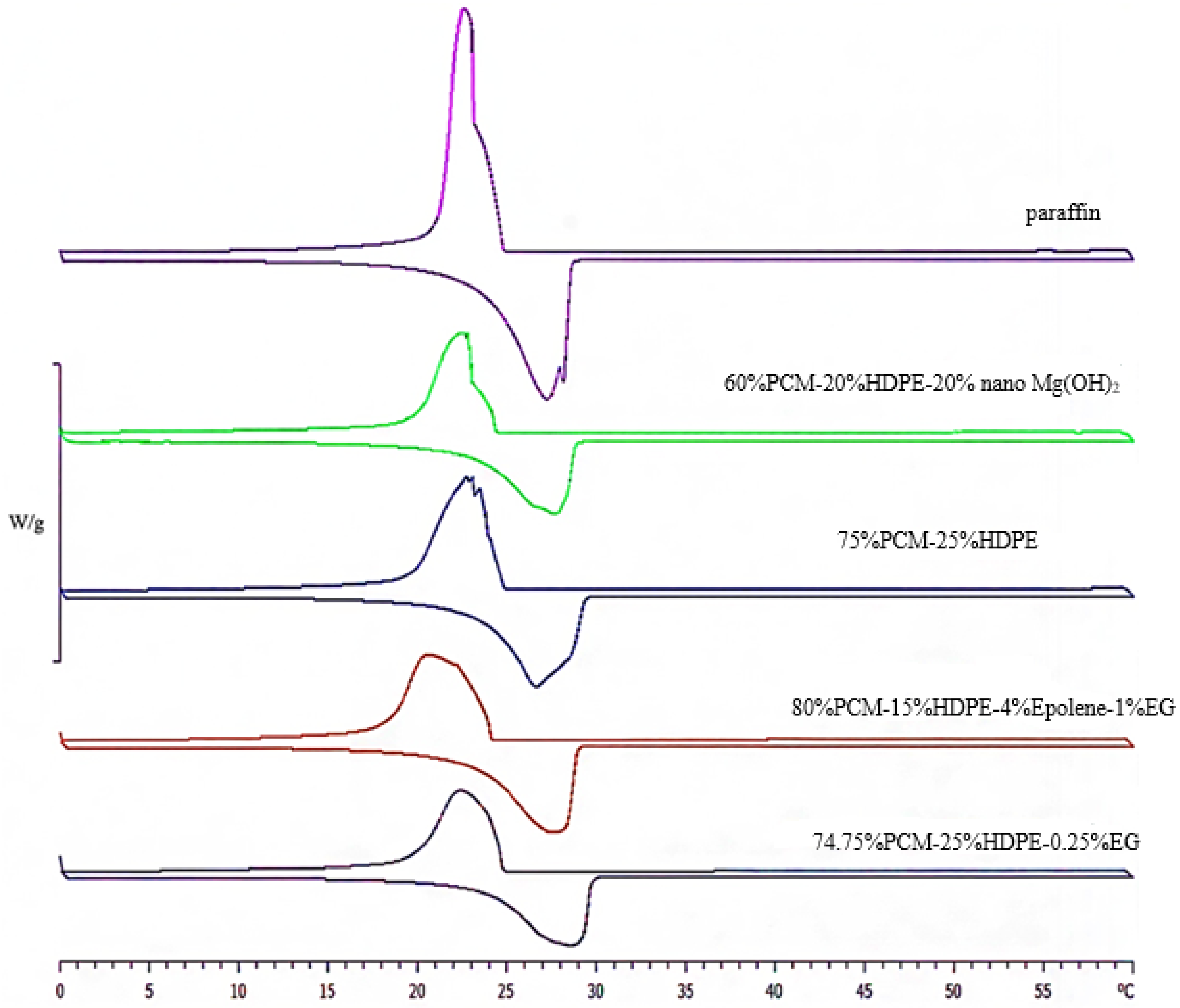 - The addition of Epolene (C-26, or C70) was carried out by melting Epolene with HDPE before the addition of the paraffin. For the SSPCM containing expanded graphite, exfoliated graphite nanoplatelets (xGnP) or nano magnesium hydroxide, the addition of these materials was performed gradually to the molten HDPE after adding about half the amount of wax because the viscosity of the mixture at this stage is not too high and the mixing process is easier. These materials and wax were added alternatively until all the weighted materials had been added.