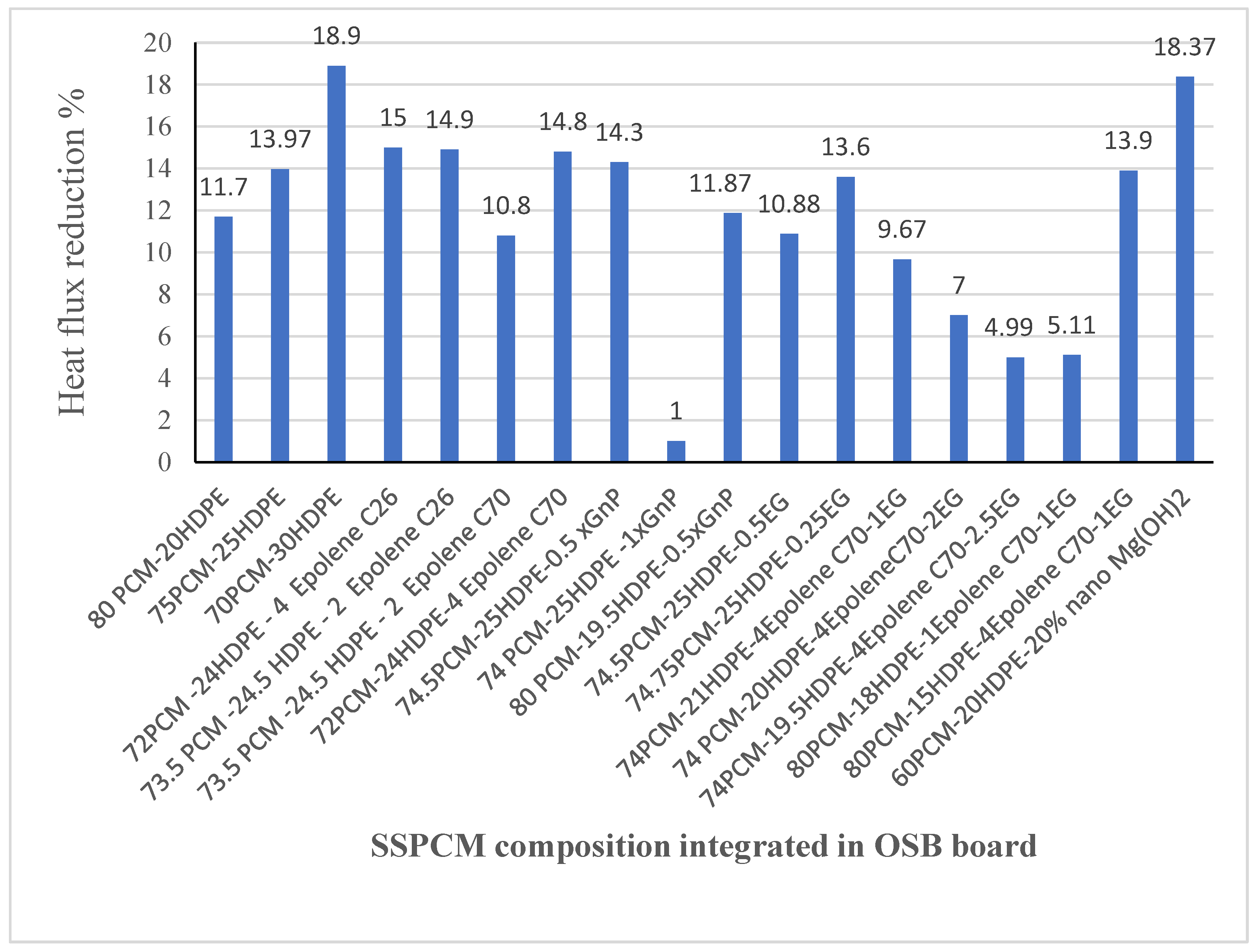 | OSB with no SSPCM | 72% PCM-24% HPDE-4% Epolene C26 | 60% PCM-24% HDPE-10% Nano Magnesium Hydroxide-6% Epolene C26 | 60% PCM-20% HDPE-20% Nano Magnesium Hydroxide | |