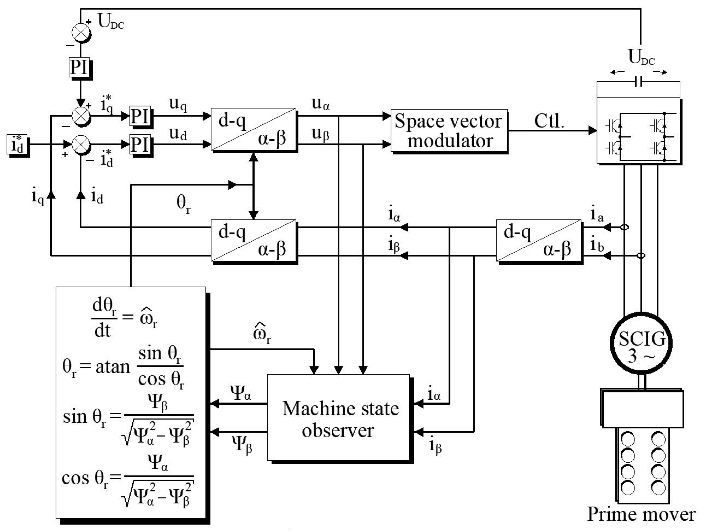 13], sliding-mode observers, or reduced-order Luenberger observers integrated into field-oriented control (FOC) or direct torque control (DTC) schemes. The aforementioned methods are currently used in motor applications, while there are little available research and information on sensorless generator operation of squirrel-cage machines, where the external DC voltage loop controls not the shaft rotation speed but the DC voltage of the intermediate circuit [