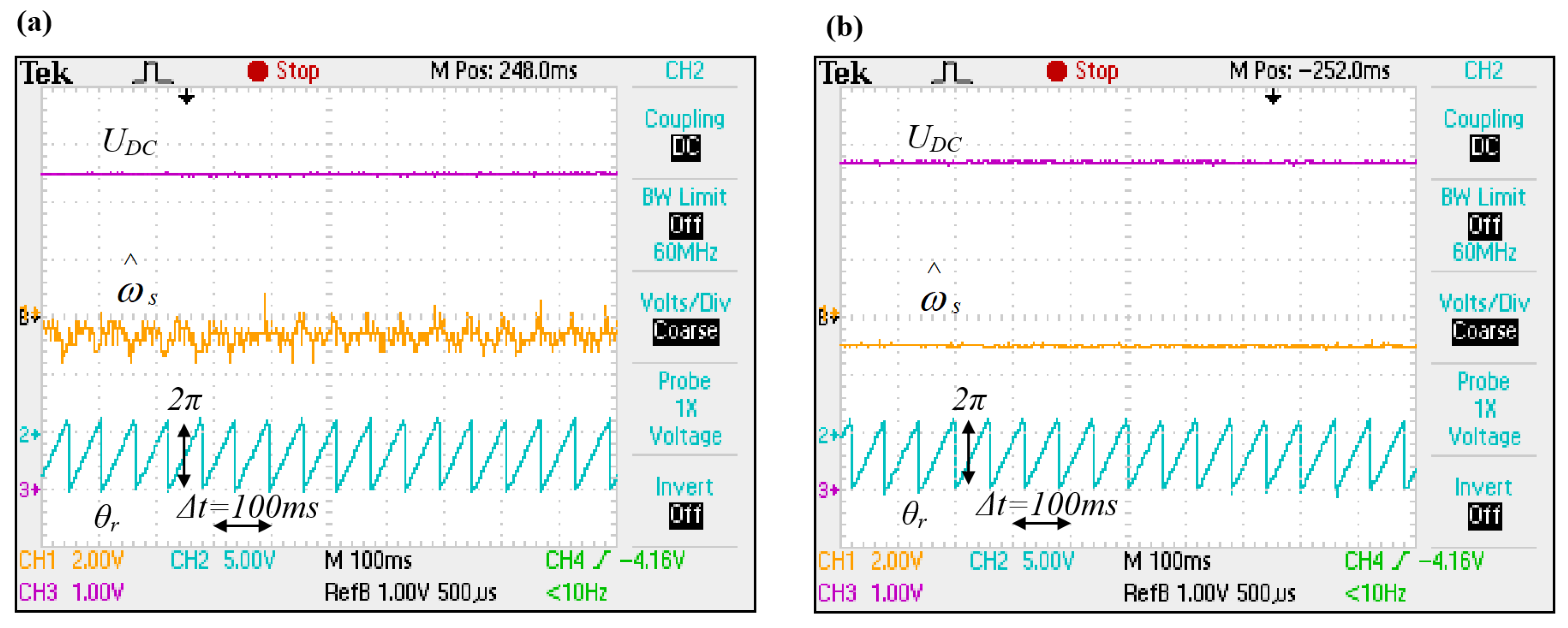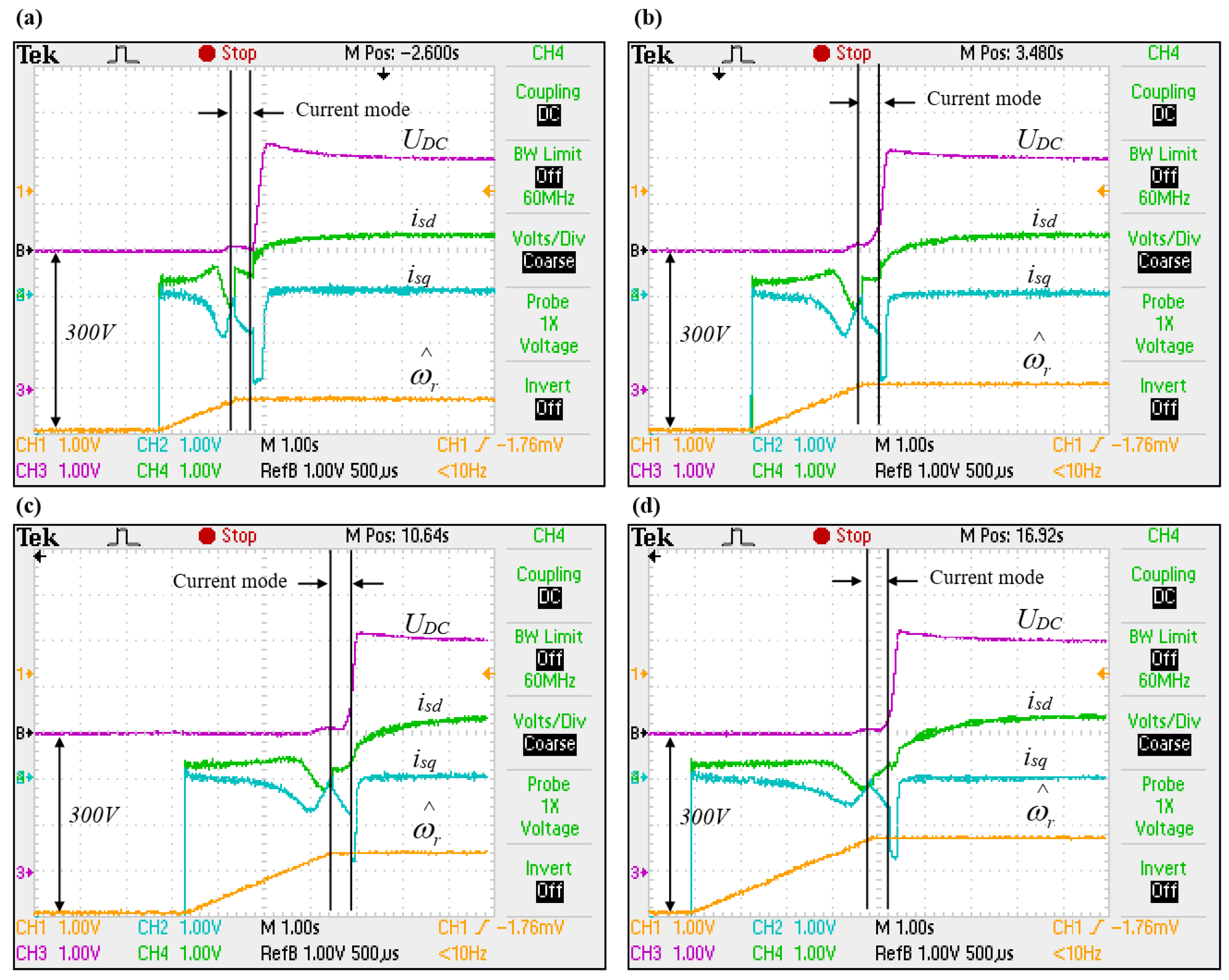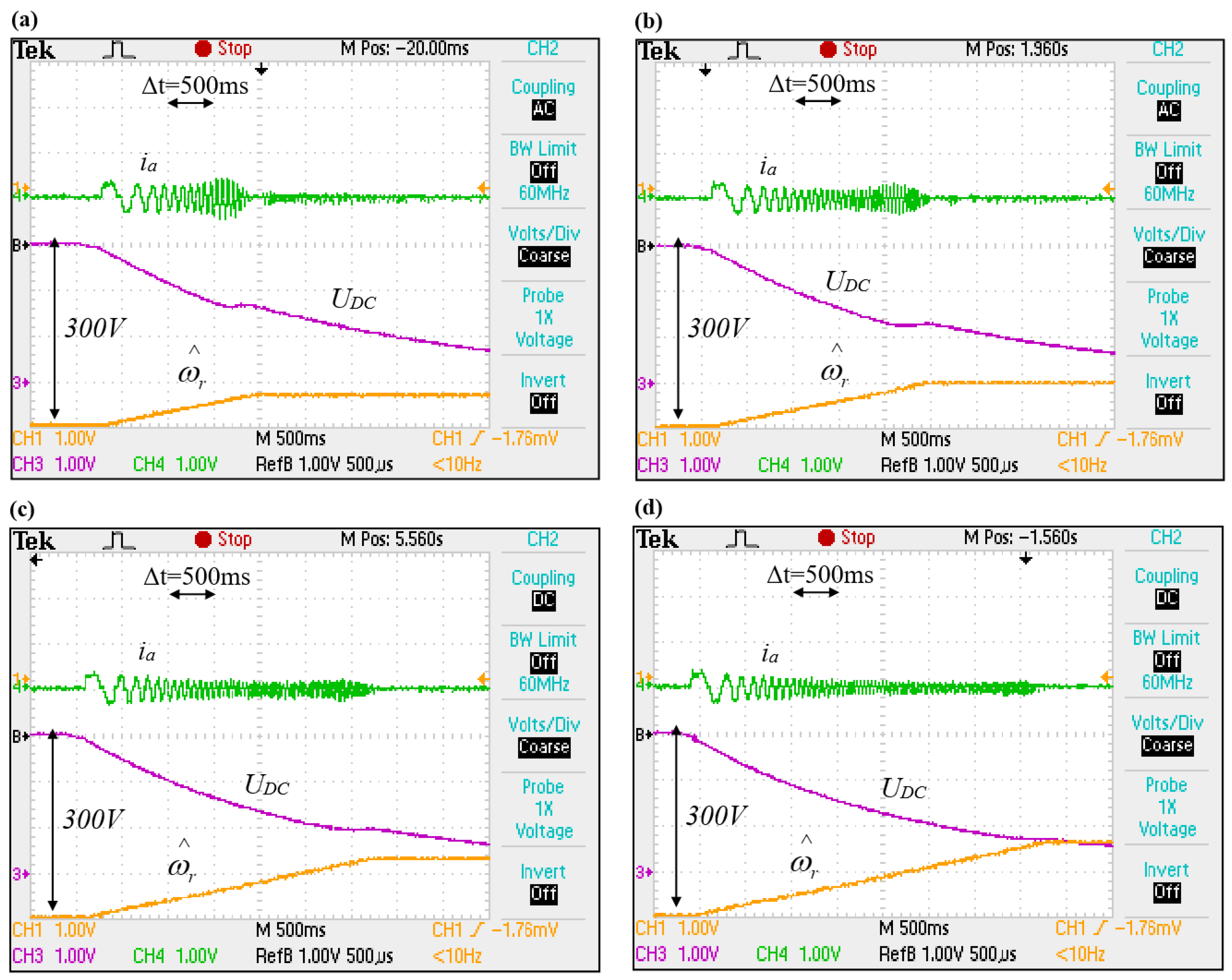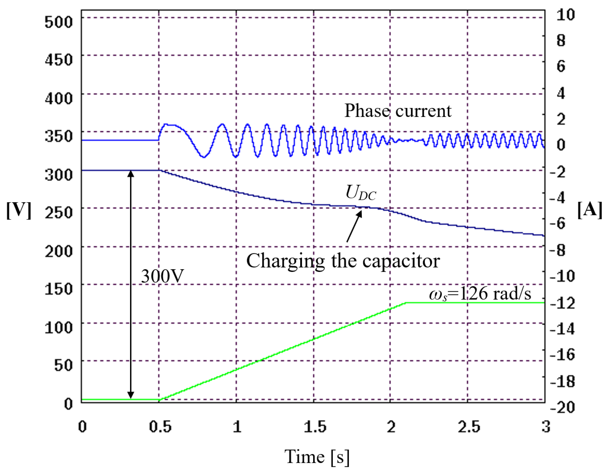 Figure 11a shows a failed excitation attempt caused by too low initial DC-link voltage and premature discharge of the intermediate circuit capacitor.