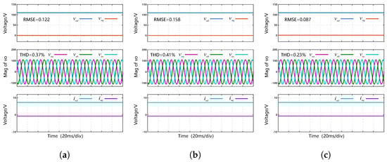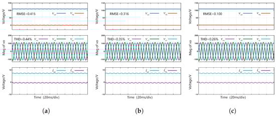 The PI control and CDO-BSC method in [11] are also implemented and compared with the proposed FTSMDO-FTBC method. Figure 3, Figure 4 and Figure 5 present the control performance test results of three control methods—traditional PI control, the CDO-BSC scheme [11] and the FTSMDO-FTBC scheme under different load conditions. The tested load conditions include linear RL loads, unbalanced loads, and load variations. Table 2 provides a performance comparison between the three control methods, where the root mean square error (RMSE) of the output voltage and total harmonic distortions (THDs) are used to evaluate steady-state performance, and overshoot and settling time are used to assess dynamic performance.