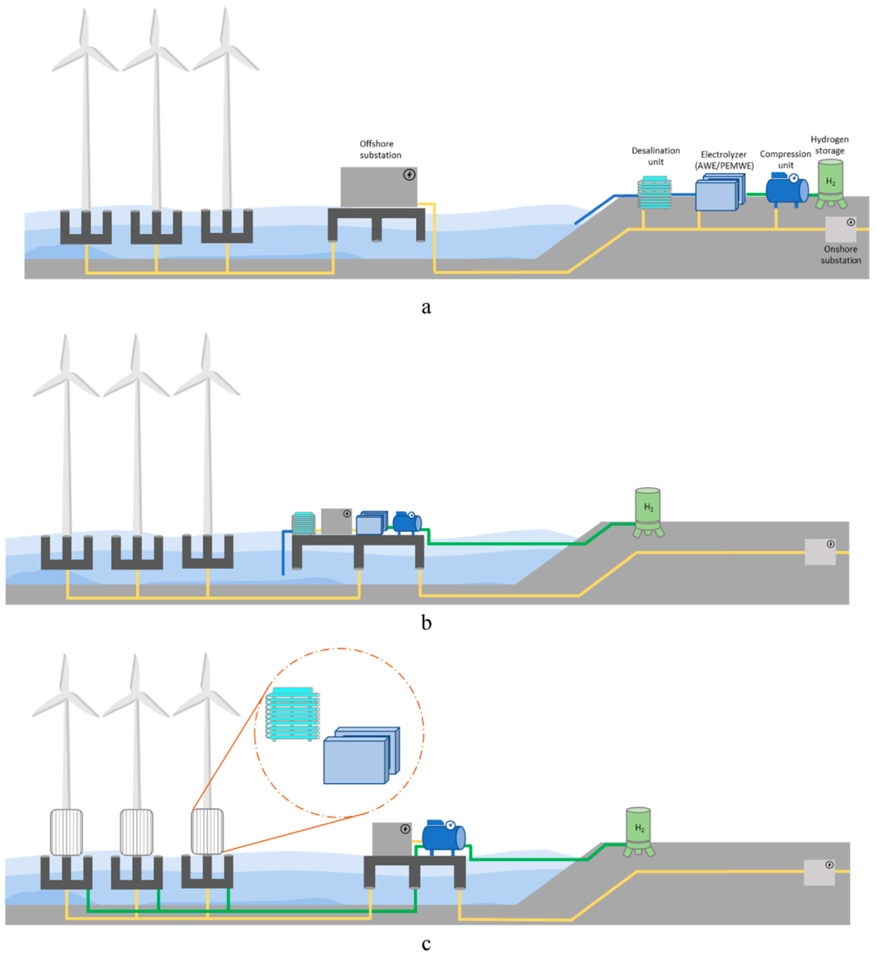 Three main plant topologies for offshore hydrogen production: (
