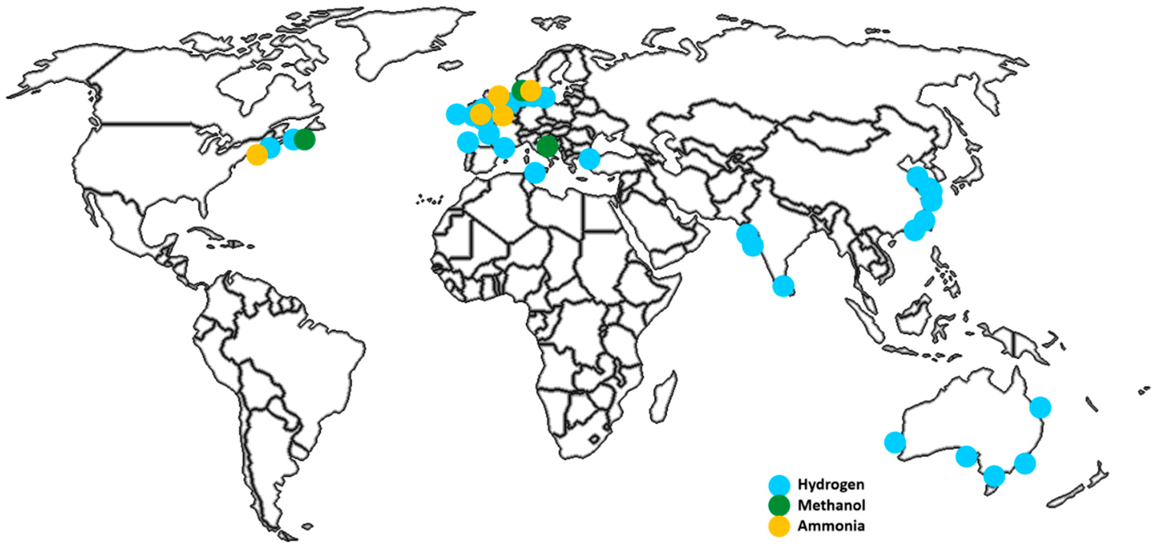 18] began their comparison by stating an important fact: sea and air transport are under the same pressure as other industries for decarbonization and reducing greenhouse gas emissions, but both of these sectors require energy-dense fuels to take as little space and weigh as little as possible during voyages, and are especially difficult to electrify. Both marine and aviation industries are set to grow in the aftermath of the pandemic and show strong growth indicators up to the 2050s. The authors also drew attention to the differences between the industries: the aviation industry is more customer-facing, with passenger demands more directly influencing operations. Industry standards are centrally established and rapidly applied, and with two major manufacturers, changes can be implemented more quickly and decisively. In contrast, the maritime sector is not directly in the public mind when it comes to decarbonization efforts; with many independent manufacturers, port operators, and industry unions, changes are decided upon and implemented more slowly. Newly developed, environmentally friendly fuels’ compatibility with existing marine engines is very important for their successful introduction to the market. Therefore, these two sectors require different approaches in the decarbonization challenge. For aviation, the two main contenders were hydrogen and e-kerosene—while there were trials of battery-powered flight, these could not provide the long-distance capabilities required by intercontinental routes. E-LNG and e-methanol did not offer sufficient energy density to be valid options. Hydrogen was one possible future fuel, but at the time, the industry was leaning towards e-kerosene and bio-kerosene as drop-in low-GHG fuels. In both cases, a major decline in electrolysis costs was expected in the 2040s to make these options economically viable. The marine industry could afford more choices in environmentally friendly fuels due to larger storage space and less dependence on low weight. Herem battery-powered vessels were a more feasible approach, but the industry was, again, leaning toward liquid fuels. E-ammonia and e-methanol were leading candidates, with e-ammonia offering lower overall costs for the industry. When carbon emission taxes were applied, however, hydrogen took the lead in total costs and was expected to be a major option, especially with the maturing of electrolyzer options and reductions in costs.