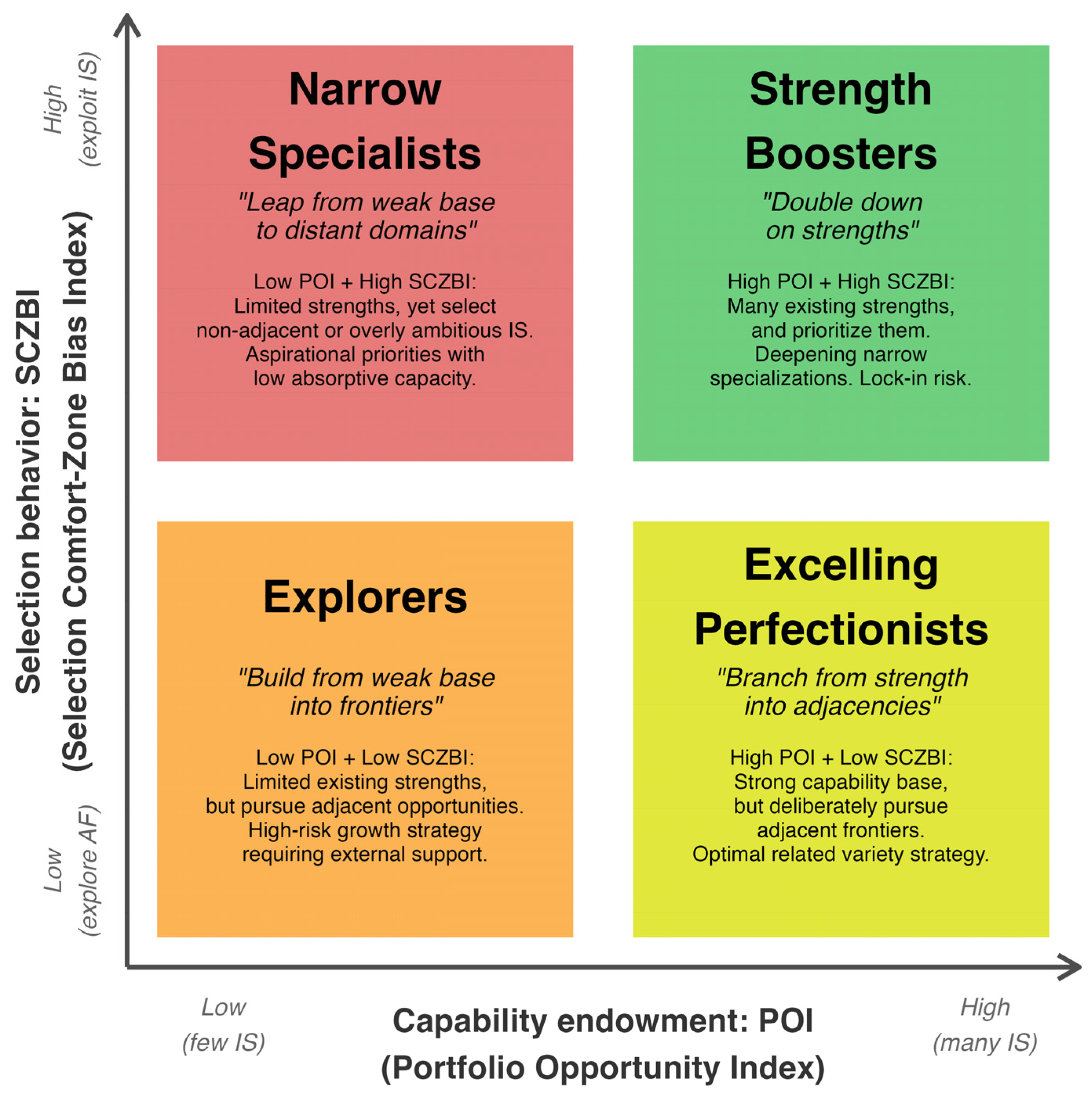 - Excelling Perfectionists (high POI, low SCZBI): Strong capability base but deliberately pursue AF. Optimal related variety strategy.