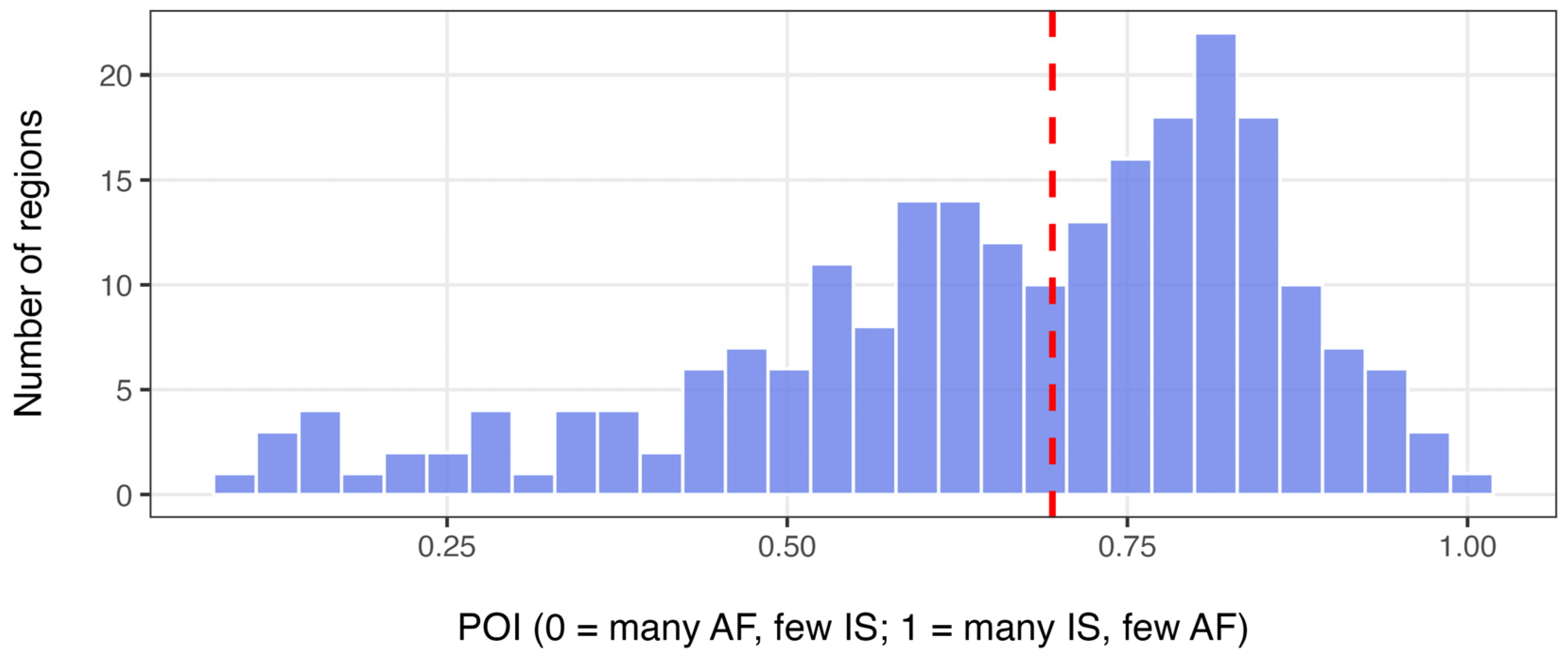 | POI Quartile | Number of Regions | Mean POI | SD POI | Mean Number of IS | Mean Number of AF | Mean Total |