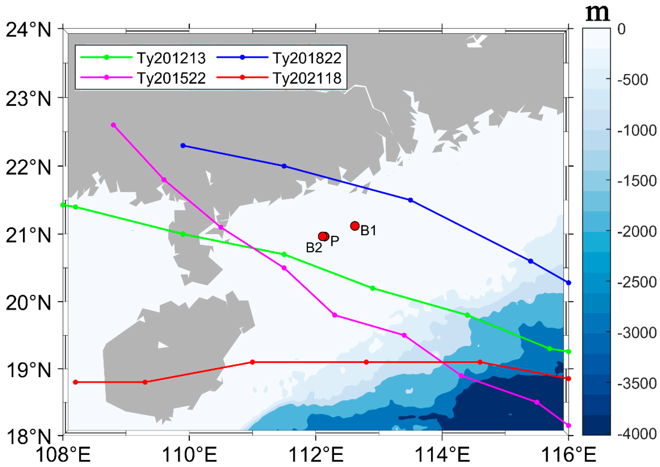 Figure 1. The required water depths for the SWAN model, along with the locations of buoys B1 and B2, project position P, and the typhoon tracks for Ty201213, Ty201522, Ty201822, and Ty202118.