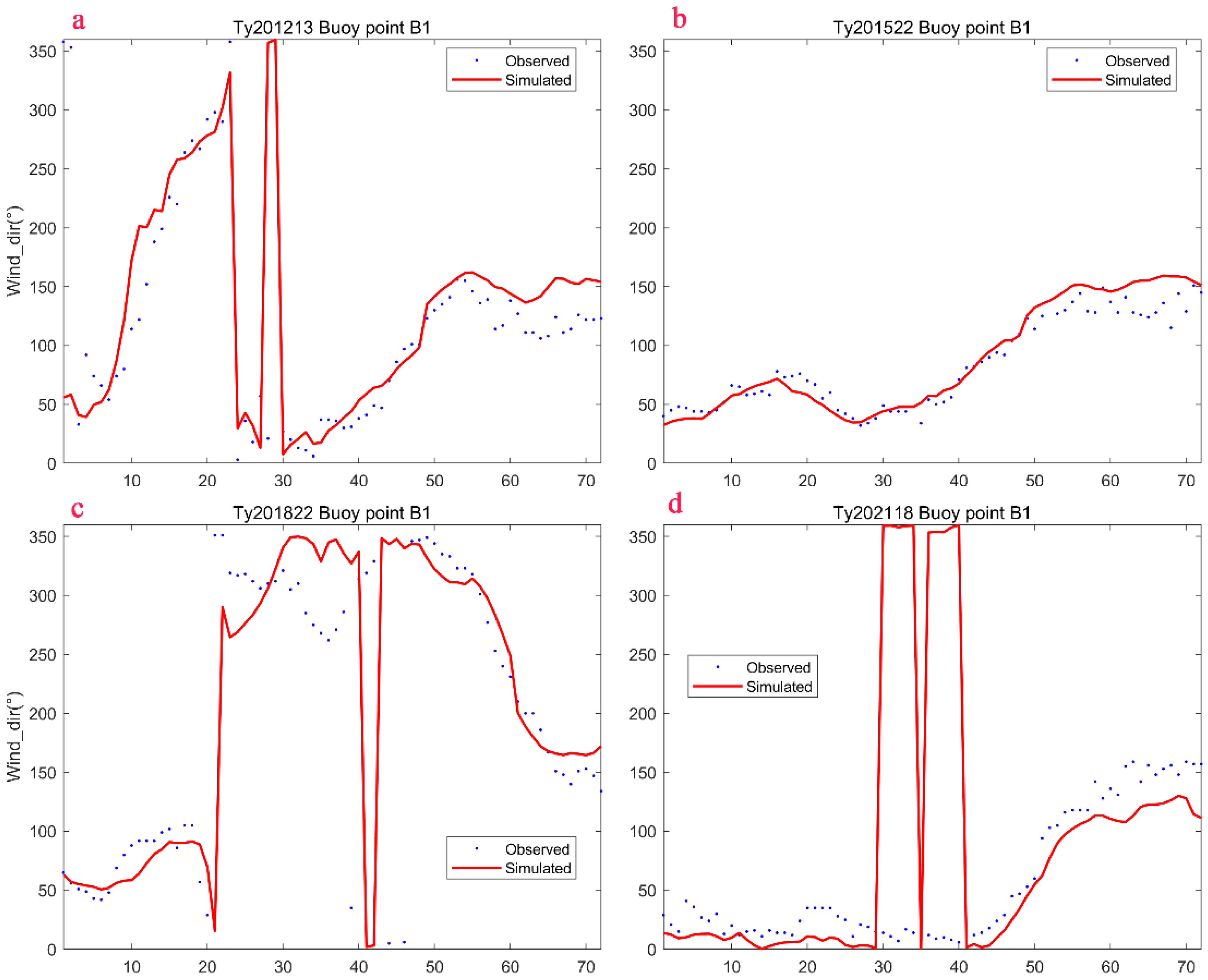 Figure 3. Comparison of simulated and observed wind direction at the B1 buoy during typhoon events (a) Ty201213, (b) Ty201522, (c) Ty201822, (d) Ty202118.
