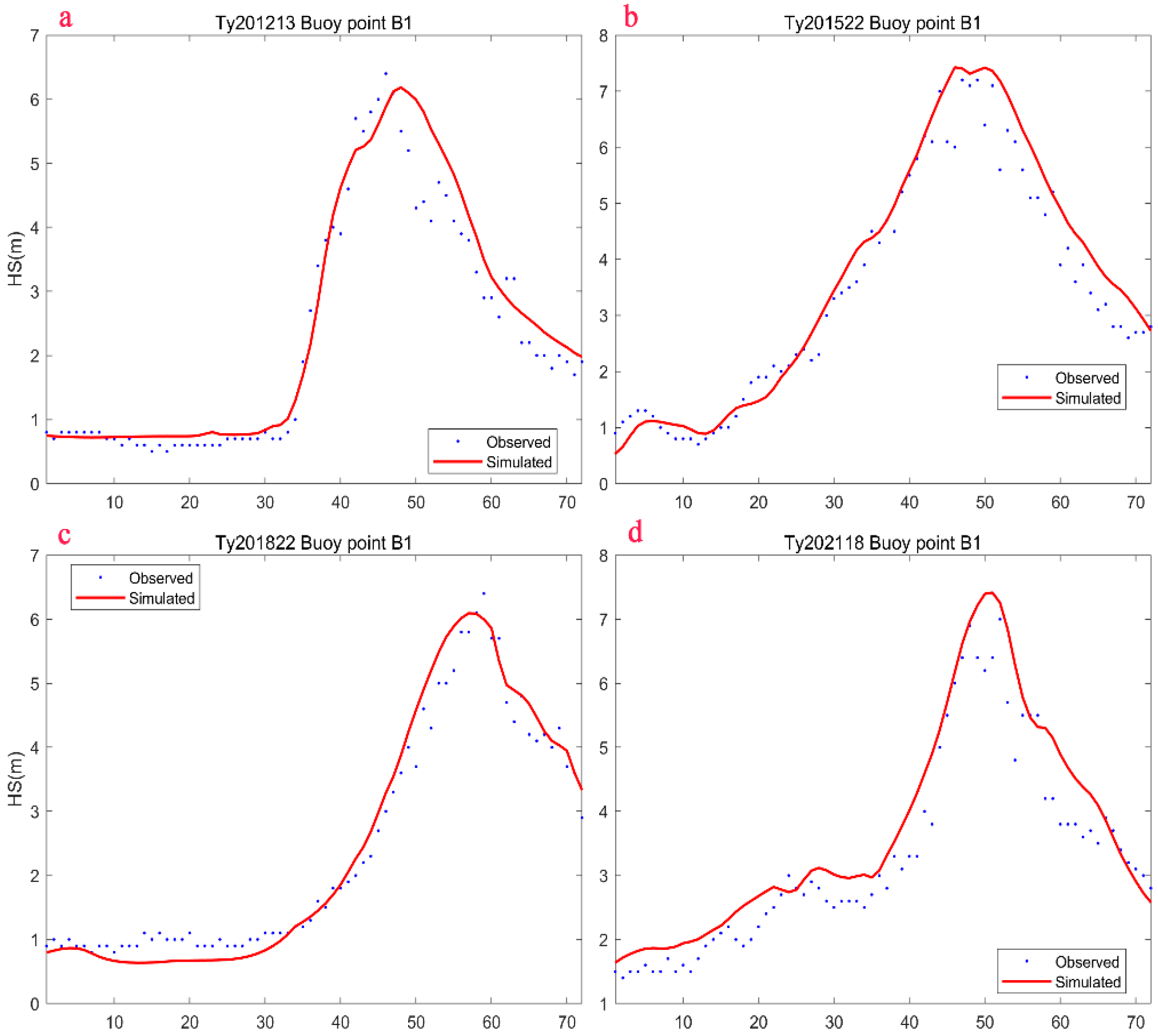 Figure 4. Comparison of simulated and observed HS at the B1 buoy during typhoon events (a) Ty201213, (b) Ty201522, (c) Ty201822, (d) Ty202118.