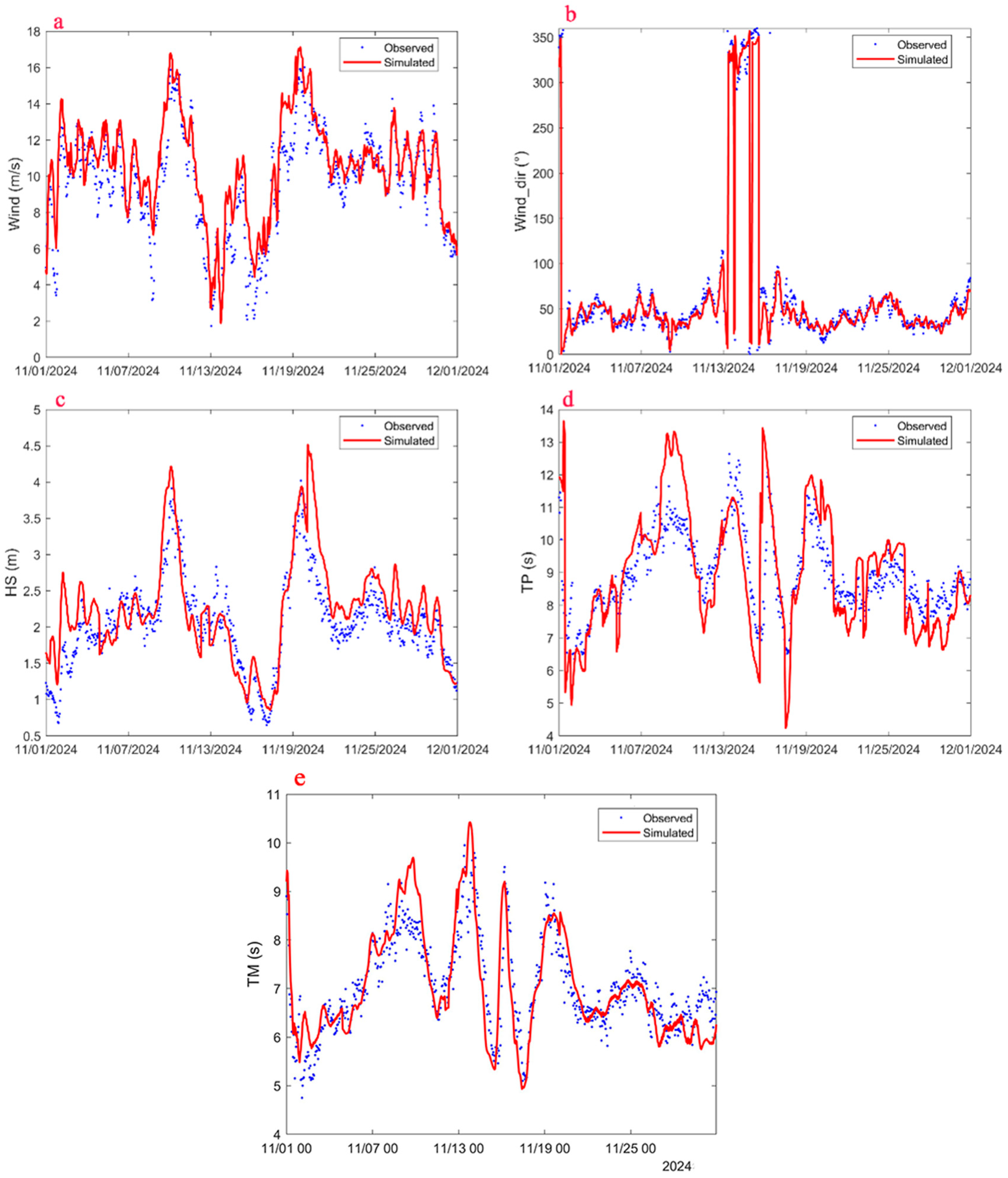 To validate the simulated data in the engineering sea area during typhoon conditions, we selected the B1 buoy for verification using observed data from typhoons Ty201213, Ty201522, Ty201822, and Ty202118. Figure 2, Figure 3, Figure 4 and Figure 5 present comparisons between observed and simulated wind speed, wind direction, HS, and TM at the B1 buoy during typhoon events. The results indicate that the simulated data align well with the observed data, with the simulated maximum wind speed and HS showing high consistency with the observed values. Additionally, the temporary buoy B2 recorded the observed wind speed, wind direction, HS, TM, and peak periods (TP) data from 1 November 2024 to 1 December 2024. Figure 6 presents a comparison of observed wind speed, wind direction, HS, and TP data from the B2 buoy under normal weather conditions with simulated data. The results demonstrate that the WRF and SWAN models can effectively simulate the wind and waves in the engineering sea area during normal weather conditions.