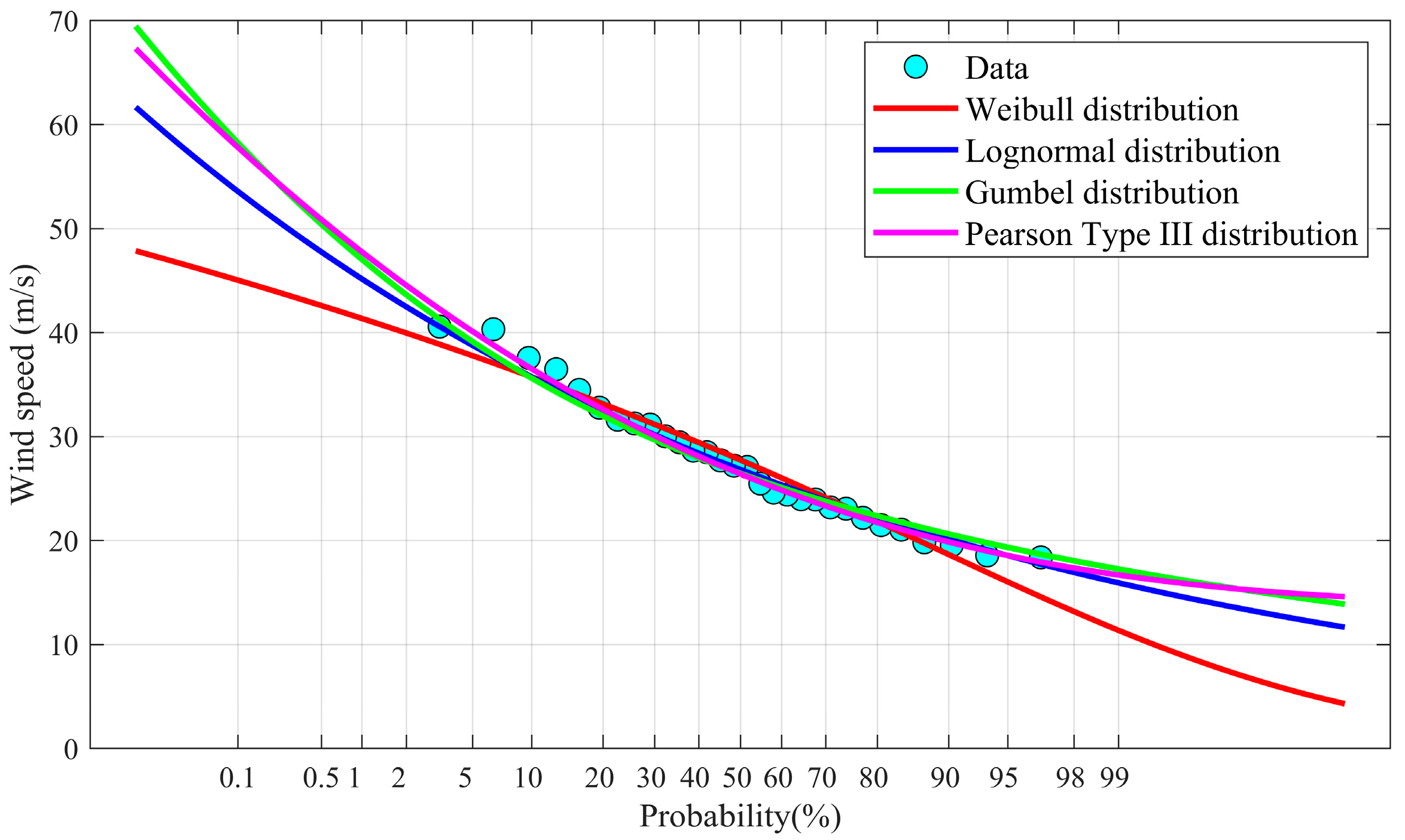 Using the WRF and SWAN models, we conducted a 30-year (1994–2023) reanalysis of marine environmental element data for the project sea area. Based on the 30-year reanalyzed marine environmental element data, we applied the Weibull, log-normal, Gumbel, and P-III models to fit the probability distribution of annual wind speed extremes. The fitting results are shown in Figure 7.
