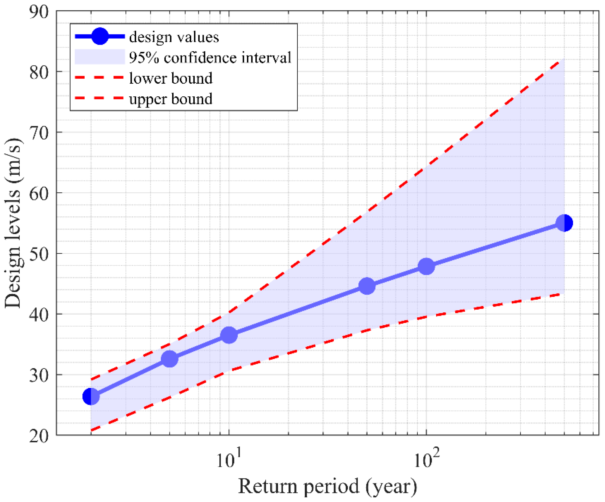 The mean wind speeds at project point P for different return periods, heights, and t time periods are shown in Table 5. Figure 8 presents the design levels (ordinate) corresponding to different return periods (abscissa, logarithmic scale), where blue solid points denote the design values, the light purple shaded area represents the 95% confidence interval, and the red dashed lines mark the lower/upper bounds of the interval. Notably, the underlying data sample of this study has a length of 30 years. When extrapolating to ultra-long return periods (e.g., 500 years) based on such a short sample, the uncertainty of statistical extrapolation will be further magnified, leading to an even broader confidence interval (inferred from the trend in this figure). Such a wide interval implies a large fluctuation range of design values for ultra-long return periods, which poses challenges to the safety margin assessment of marine engineering structures. This also highlights the practical significance of optimizing modeling methods (e.g., non-parametric approaches like KDE) to mitigate extrapolation uncertainty.