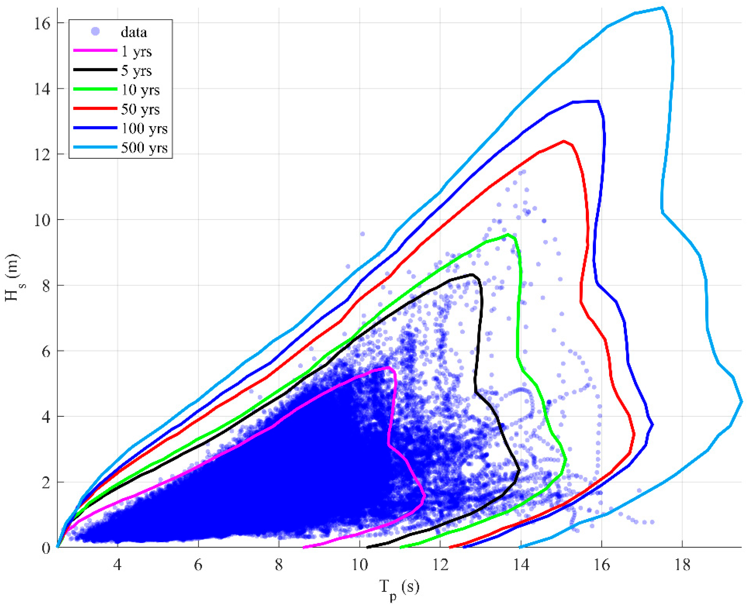 Figure 9. Hs-Tp environmental contours for various return periods at project point P.