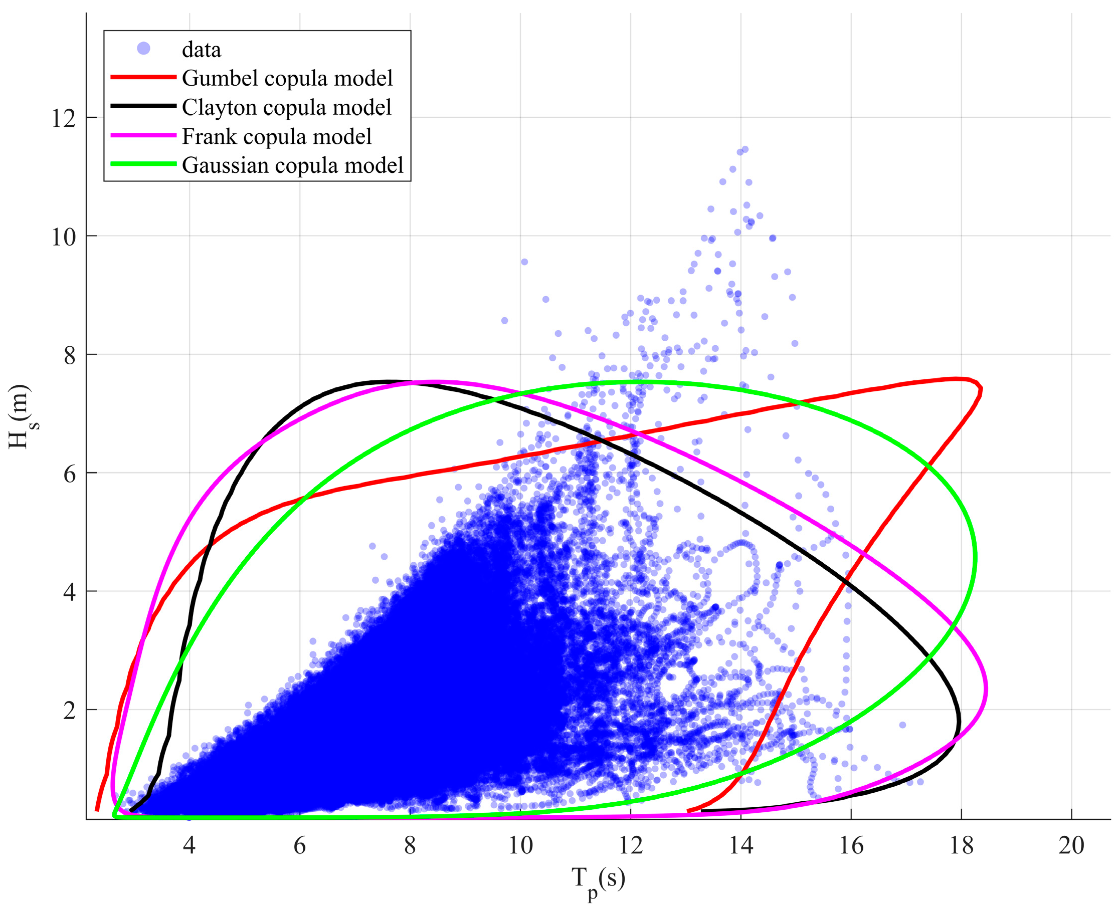 Figure 10. Hs-Tp environmental contours for 100-year return periods at project point P using copula models.