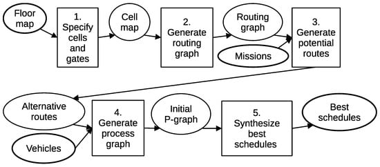 The case study presents a smaller example as an illustration, for which the related P-graph structures were manually drawn using the P-graph Studio software version 5.2.5.0. In the case of a large number of transport demands, cells, and possible routes, the graph is only constructed algorithmically as a data structure without graphical elements, based on which the MILP model describing the P-graph model can be generated. The model generation algorithm can be implemented based on the modeling steps presented in Section 3.4, enabling the full automation of the scheduling and routing problem.
