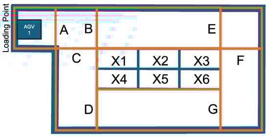 As a result, the proposed methodology produces a time-feasible, collision-free, and energy-aware execution plan for the AGV fleet. The detailed modeling steps underlying this approach are presented in the following subsections, covering floor map abstraction, routing graph generation, trajectory and time estimation, TCPNS-based process modeling, multi-AGV coordination, and battery charging management.