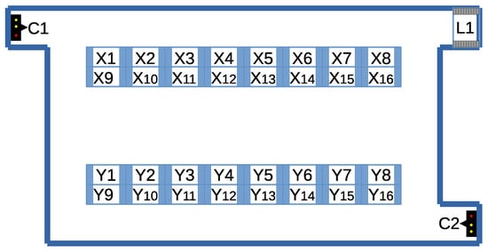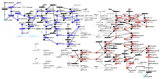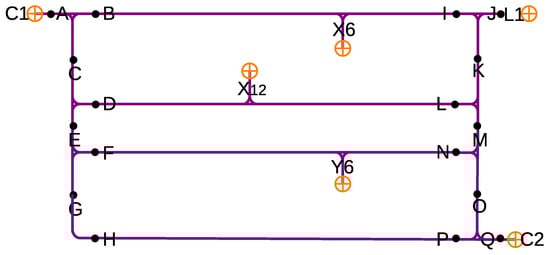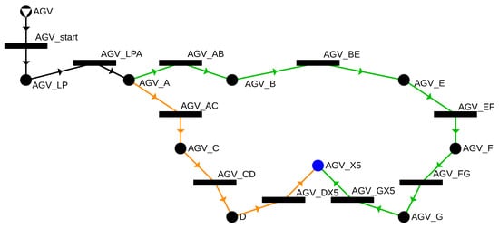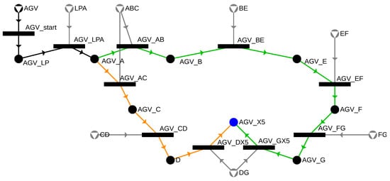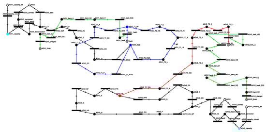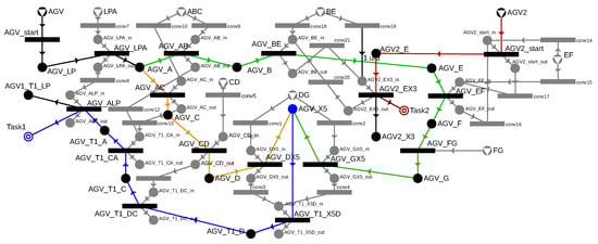 The construction of the P-graph model is based on the steps presented in Section 3.4, upon which a model-generating algorithm was developed. This algorithm is capable of generating and managing numerous alternative routes based on the set parameters. In the case study, the number of possible routes is limited in order to make the P-graph more readable: AGV1 starts from the C1 charger and reaches the starting point of task T1, which is bin X6, via the shortest route. It can then perform the transfer between bins X6 and X12 via the two shortest routes. After completing the task, AGV1 returns to the charger. In the case of AGV2, two alternative routes were considered, which allow it to reach the starting point of task T2, the Y6 bin, and it can execute the task via a single route. After completing the task, AGV2 returns to the C2 charger. The possible routes of the two AGVs intersect in the cells KLM and IJK. Figure 23 illustrates the modeling of the possible routes, where the routes for executing task T1 are marked in blue, the routes for executing task T2 are marked in red, and the routes marked in green represent the return to the charger.