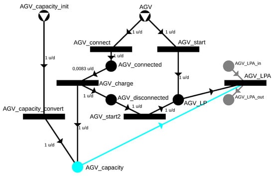The TCPNS-based model enables the simultaneous assignment of vehicles to transportation tasks, the selection of routes, and the determination of an exact execution schedule. In addition to routing and collision avoidance, the model explicitly incorporates energy-related constraints. The energy required for vehicle movements is estimated based on the selected routes, and the current battery state of each AGV is taken into account during scheduling. Furthermore, optional charging operations can be inserted into the schedule, allowing vehicles to increase their available energy before executing transportation tasks.