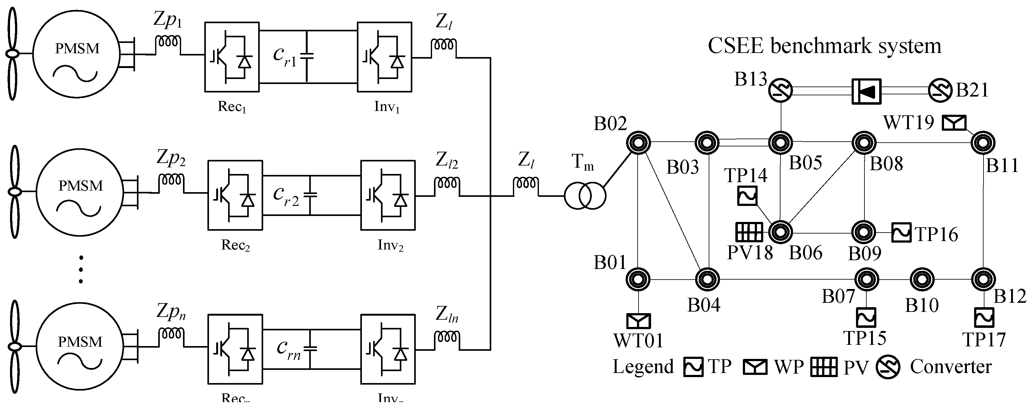 - Zheng, Z.; An, Z.; Shen, C. Evaluation Method for Equivalent Models of PMSG-Based Wind Farms Considering Randomness. IEEE Trans. Sustain. Energy 2019, 10, 1565–1574. [Google Scholar] [CrossRef]