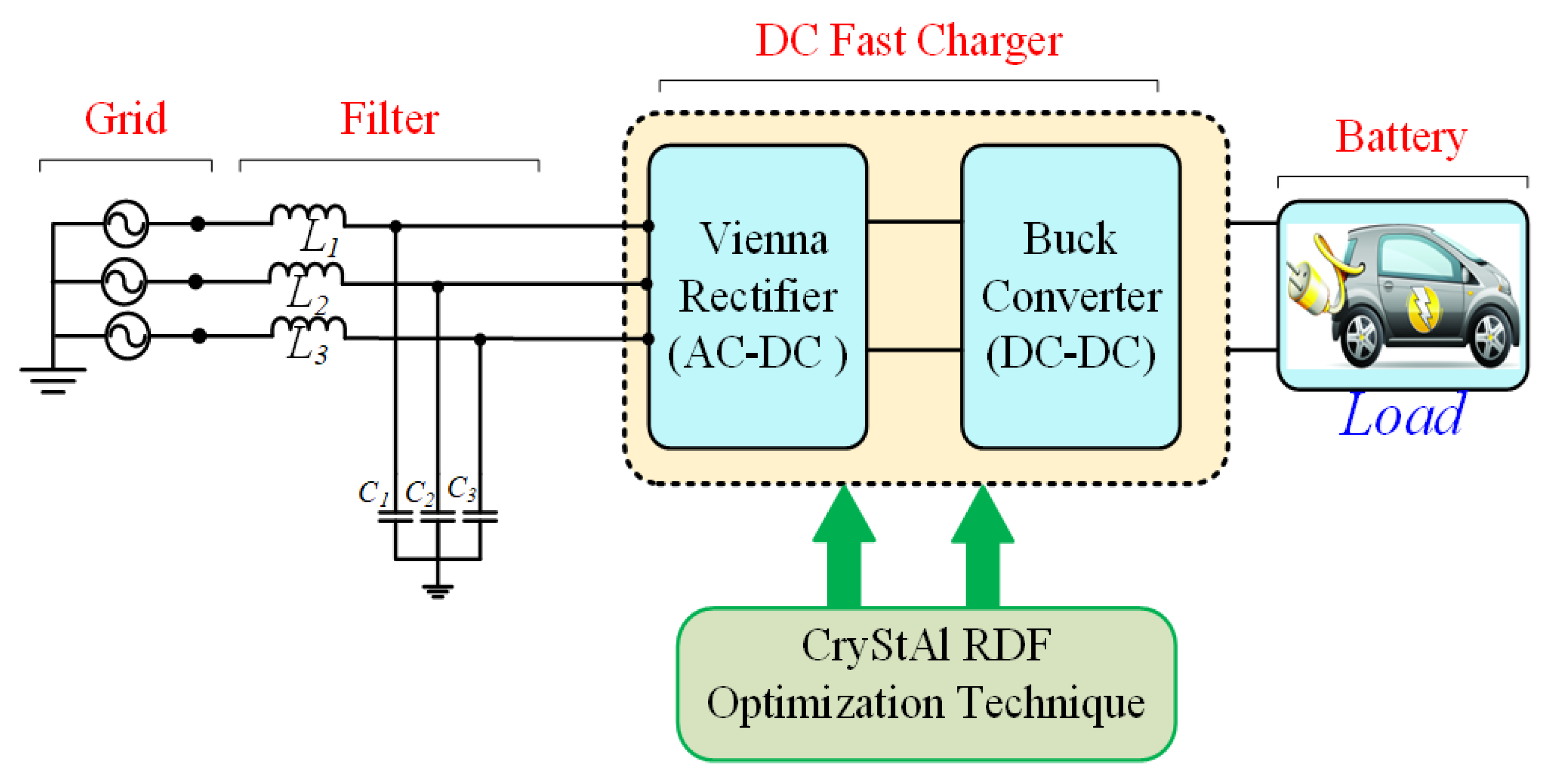 In this paper, we introduce an improved G2V power conversion system with an appropriate design for fast-charging applications. A Vienna rectifier on the AC side will be combined with a buck DC–DC converter for efficient and stable charging. A hybrid control strategy will be implemented herein, which relies on combining the CryStAl with an RDF model. The proposed approach fine-tunes the operating parameters of the converter for better efficiency, higher reliability, and improved power quality.