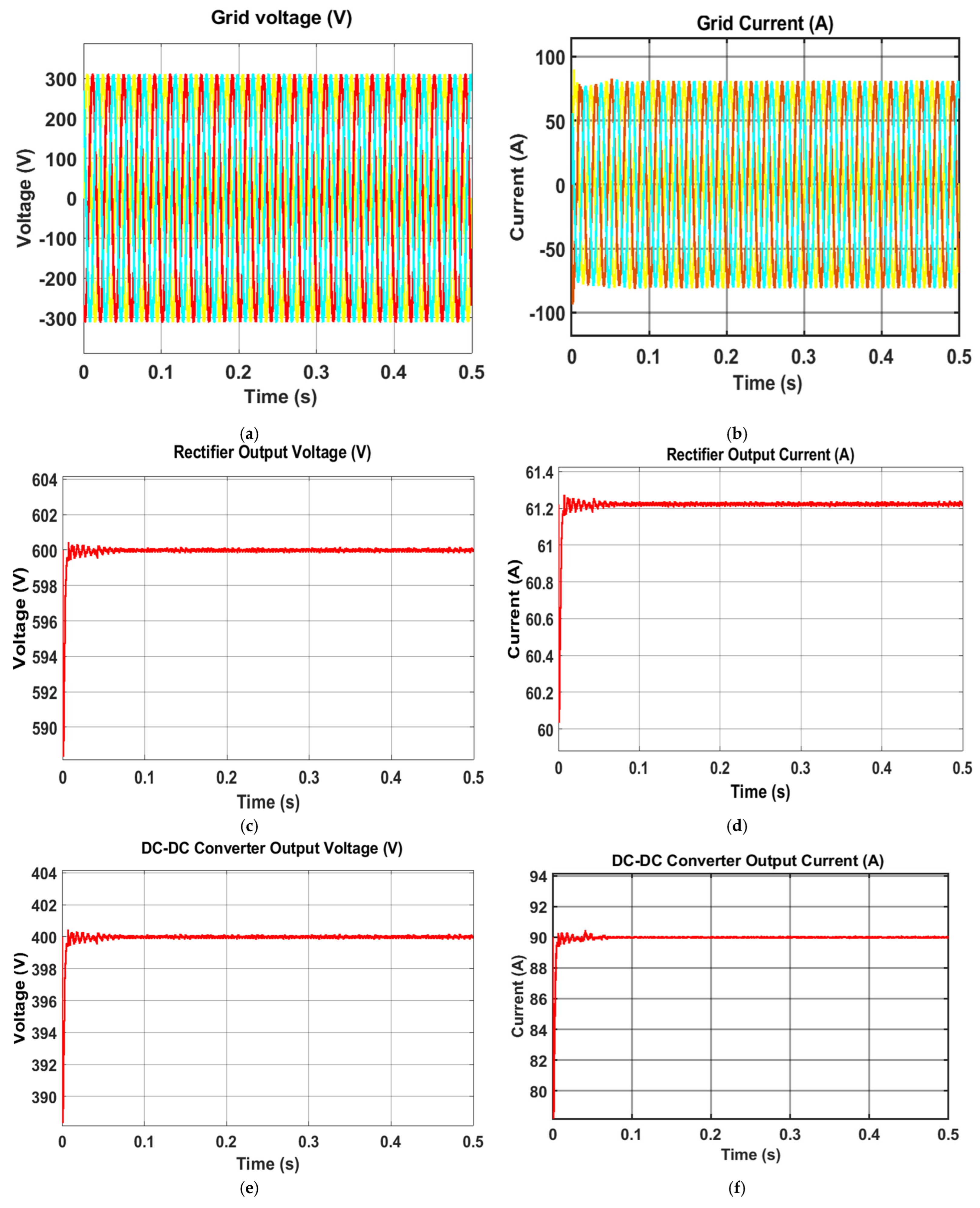 The peak-to-peak and RMS values of the voltage and current ripple were measured for the chosen steady-state period. The total harmonic distortion of the input current was calculated using fast Fourier transform analysis over a period of 10 fundamental cycles in the steady state, as recommended by IEEE.