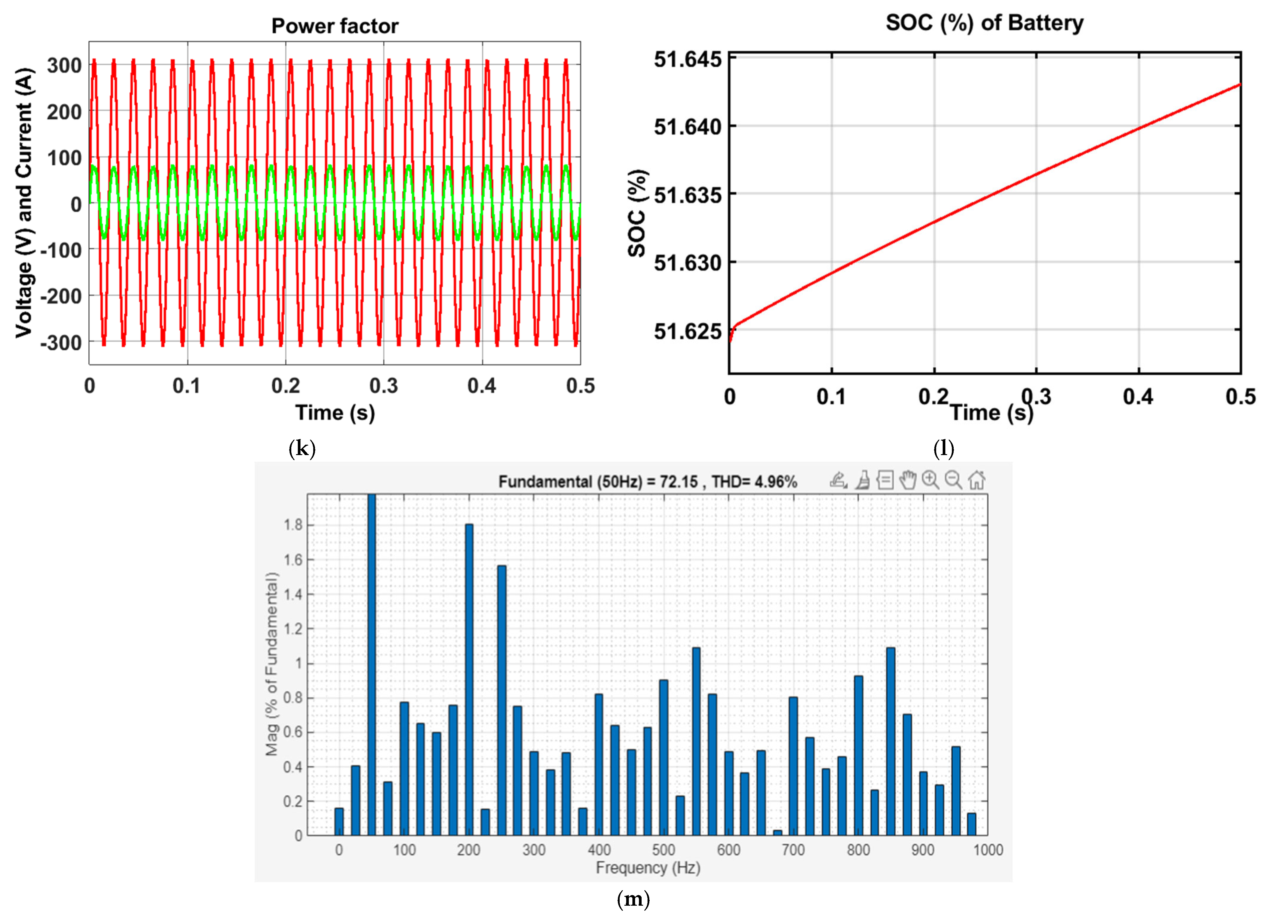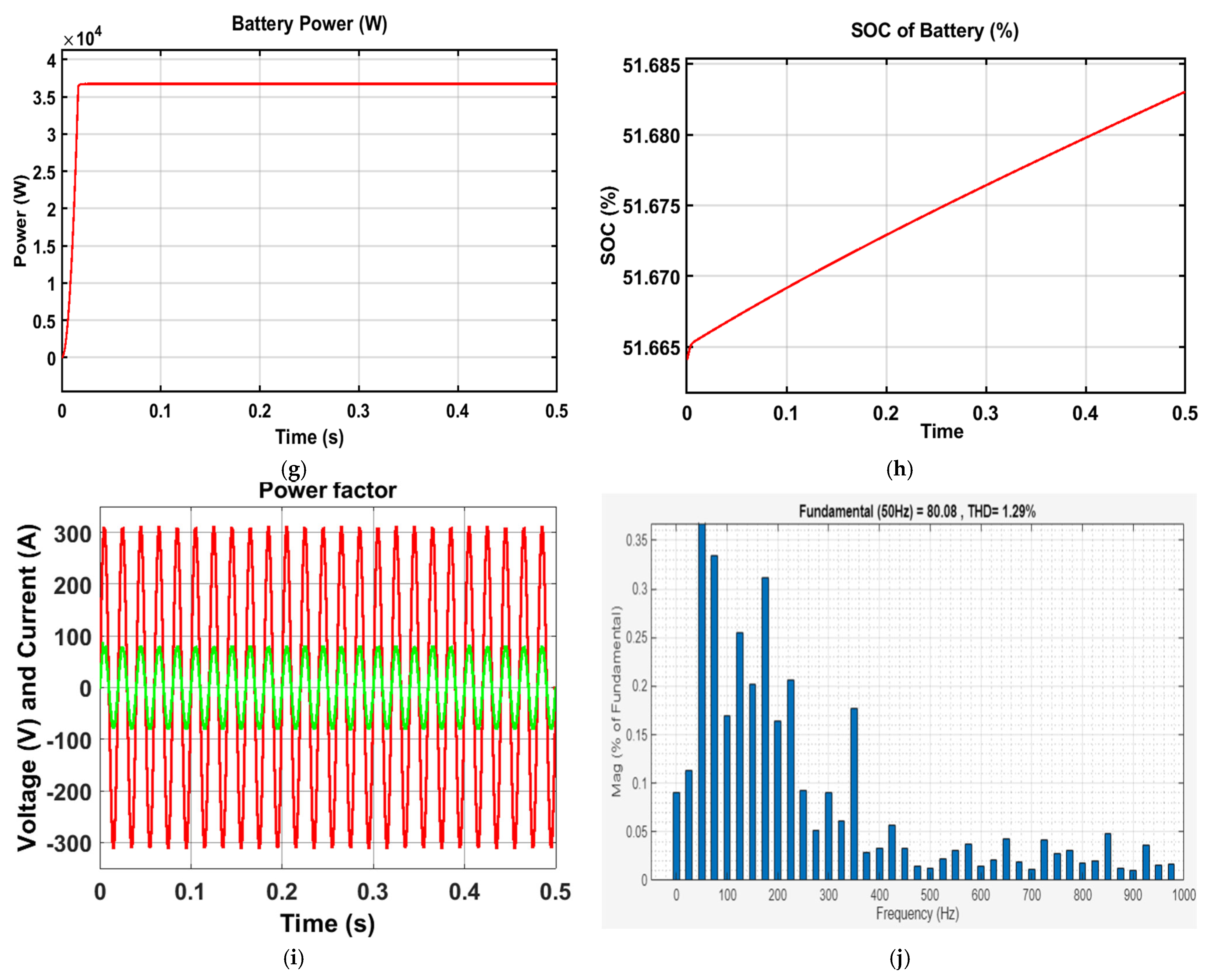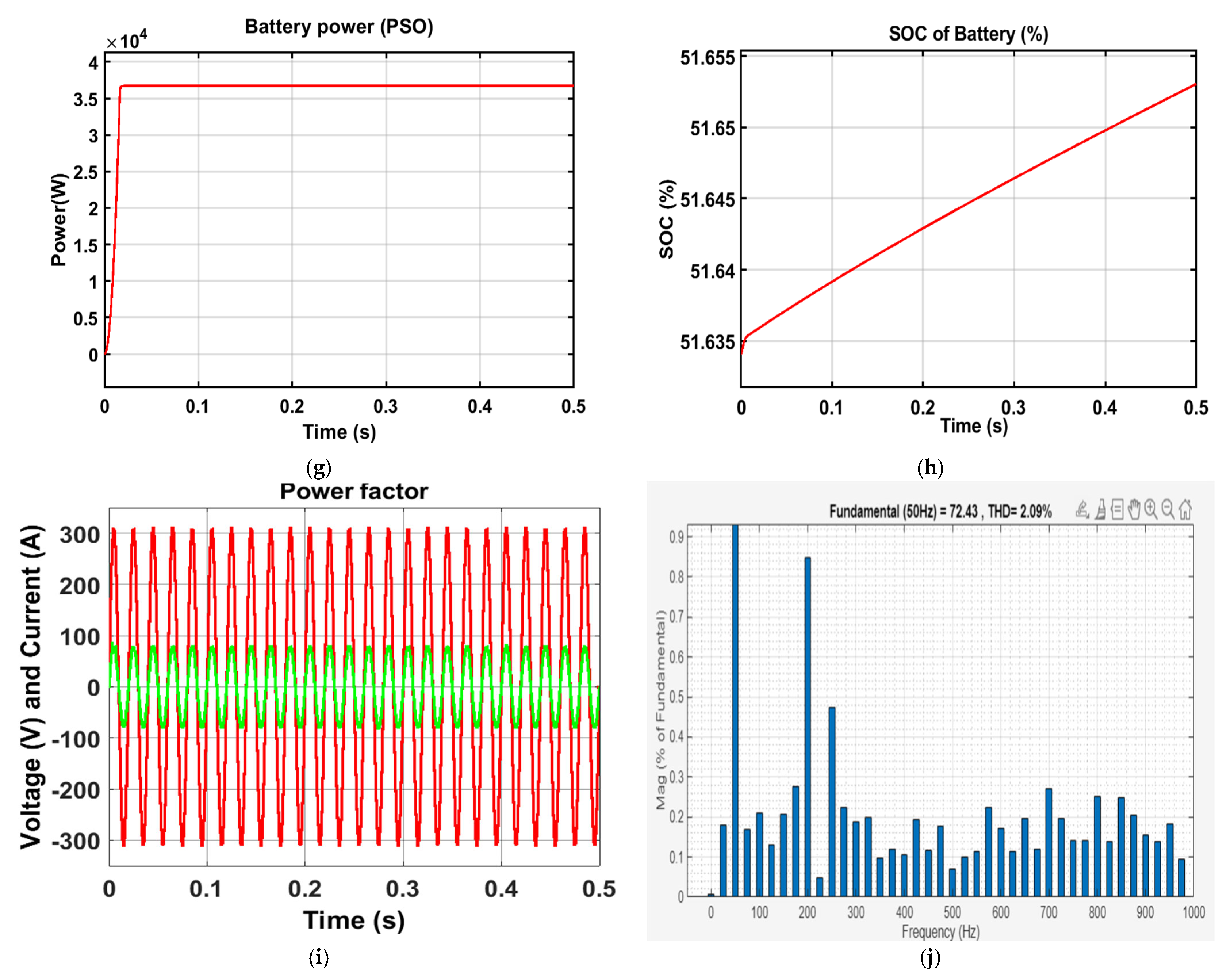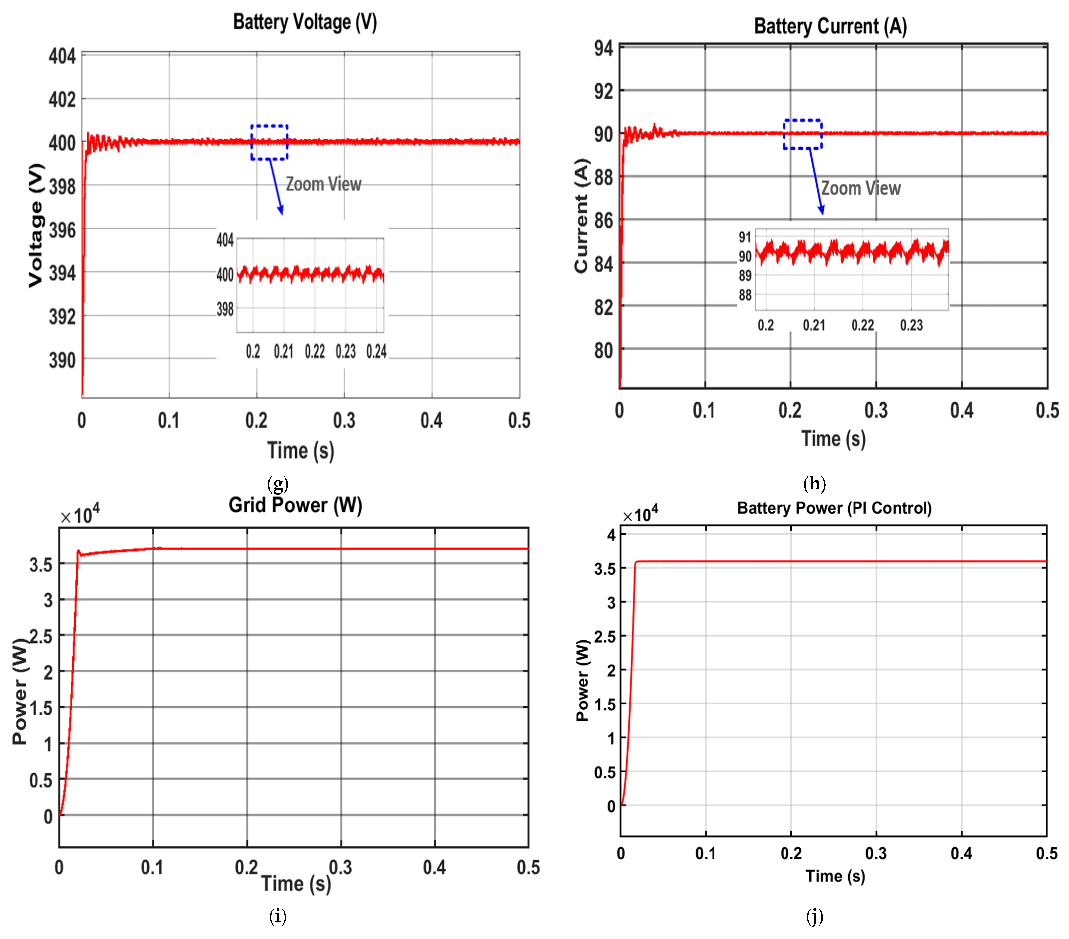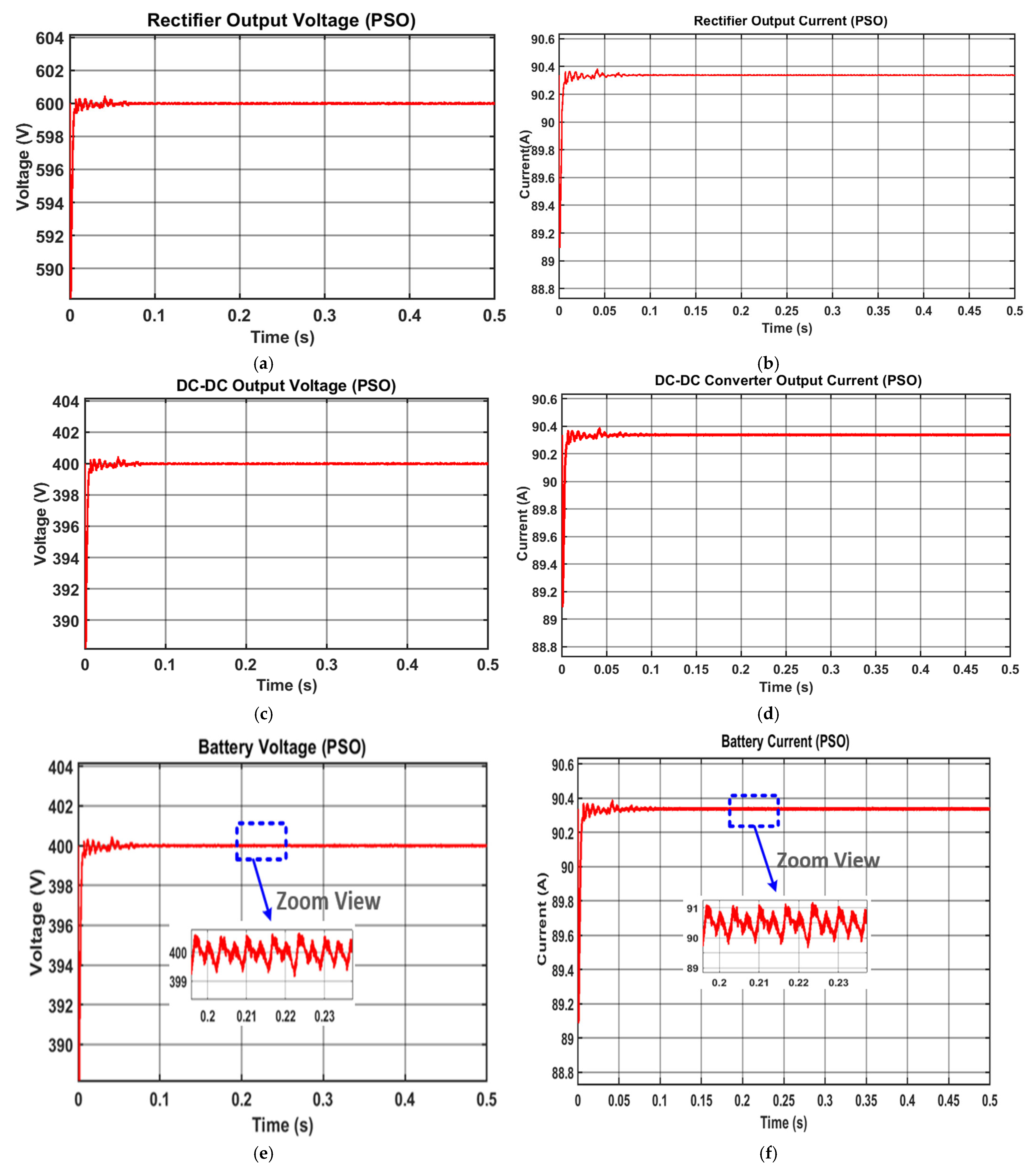 Figure 16b displays the battery voltage waveform, highlighting the ripple performance achieved with the PSO controller.