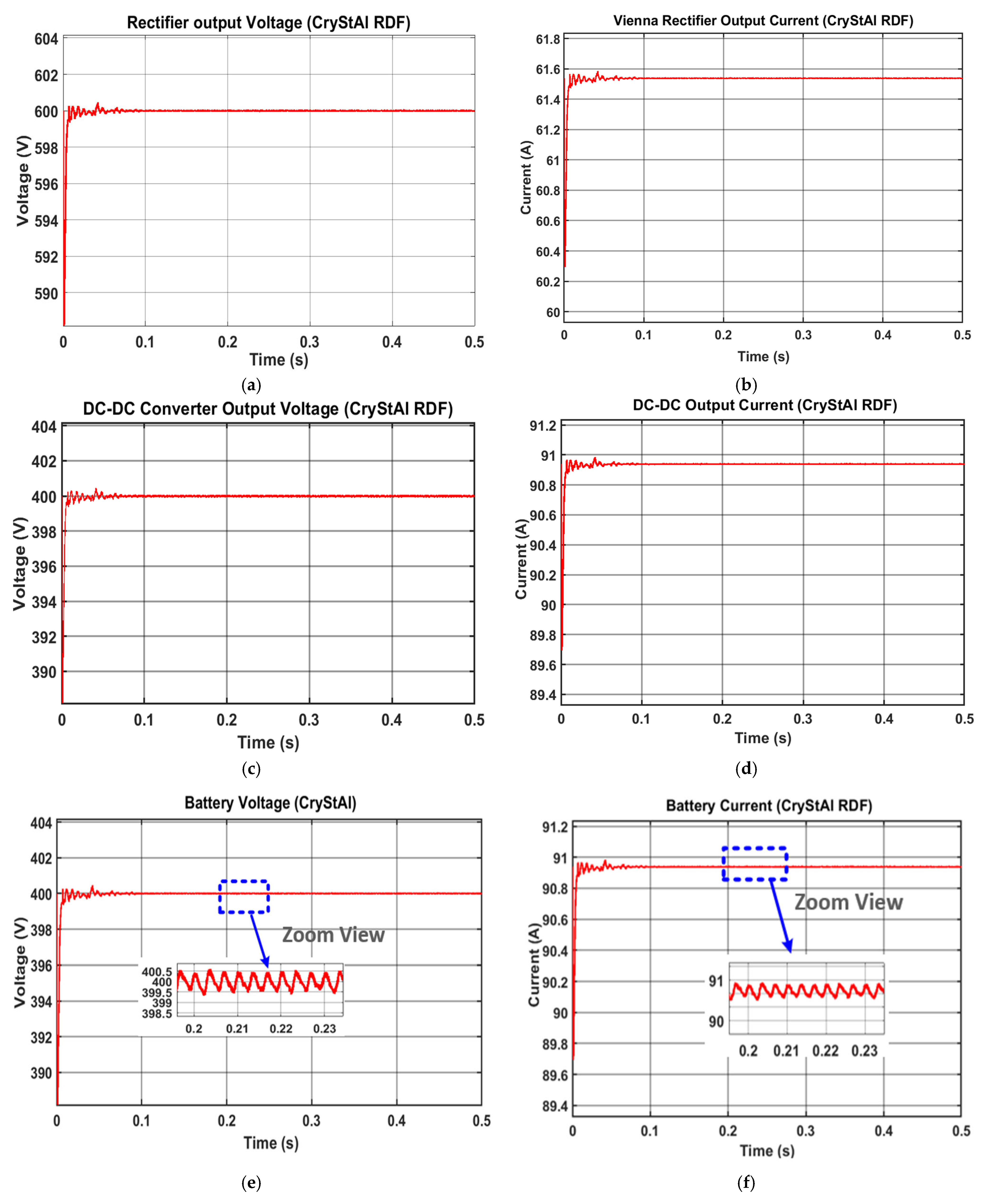Figure 15e displays the battery voltage waveform, highlighting the ripple performance achieved with the CryStAl–RDF controller.