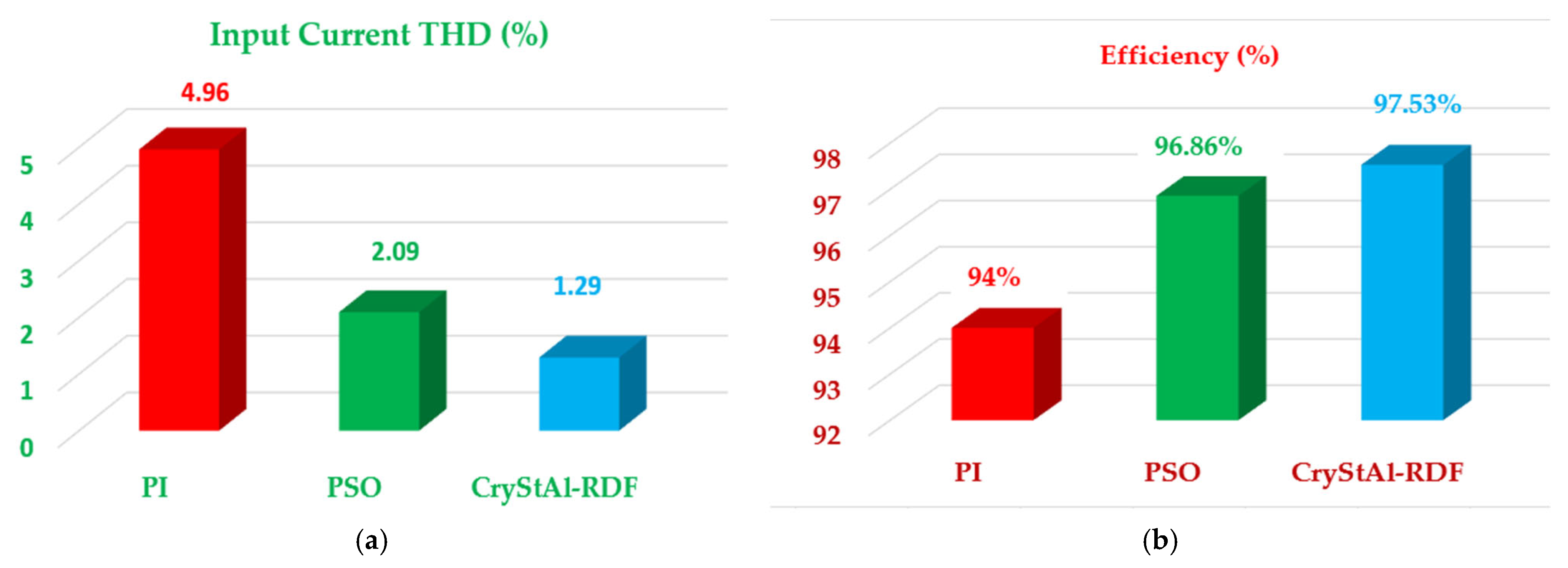 The efficiency of the converter was expressed as the ratio of the average DC output power to the average AC input power, and the power values were calculated using time-averaging of the product of the instantaneous voltage and current over the same steady-state window. All calculations were carried out using MATLAB/Simulink tools under the same operating conditions for the PI, PSO, and CryStAl–RDF controllers.