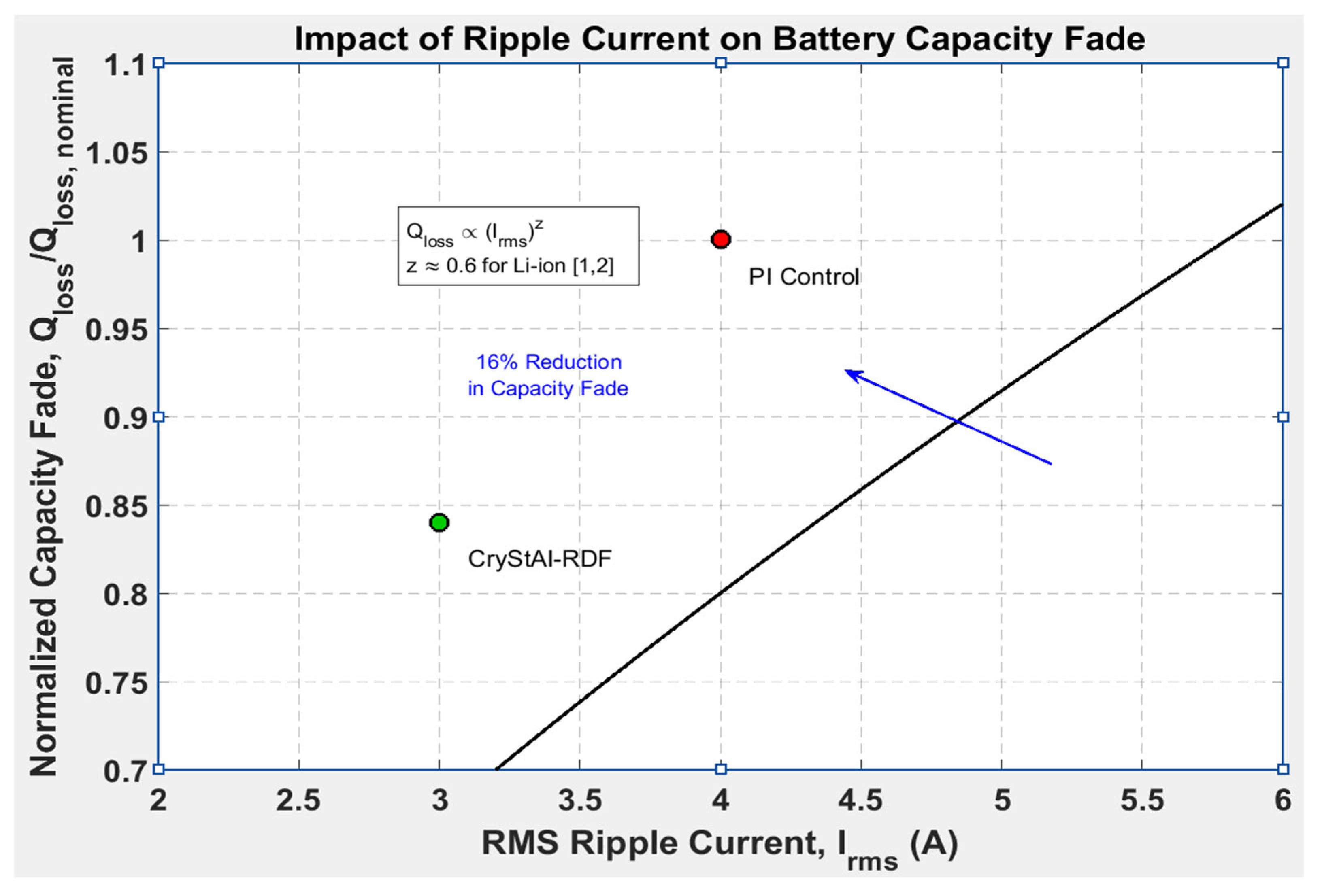 Figure 14 presents a comparison of ripple current and battery capacity fade for CryStAl–RDF and PI control.