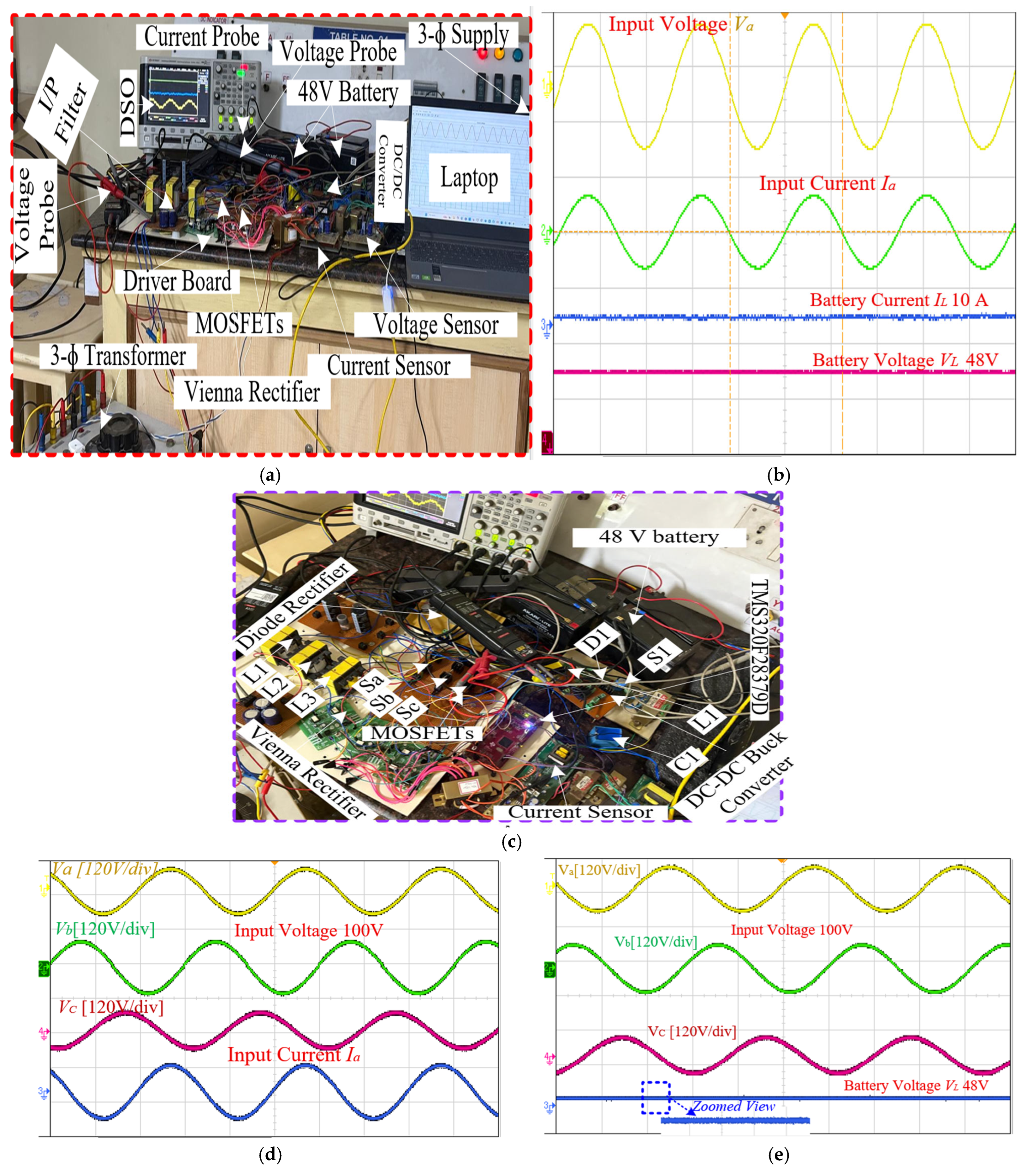 Figure 15c displays the Closer picture of the Vienna Rectifier and DC–DC Buck converter.