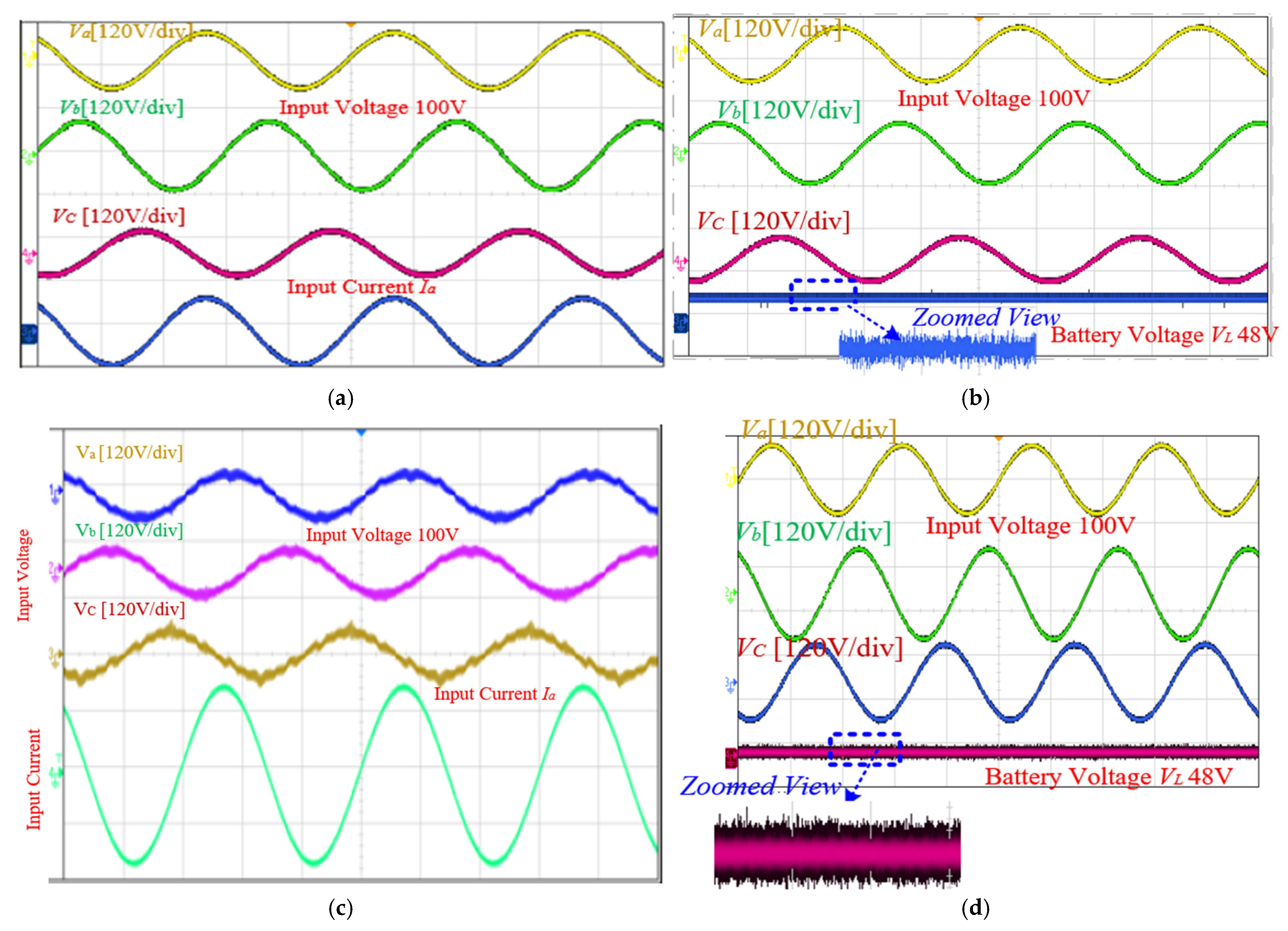 To evaluate the proposed control method, the system’s steady-state and dynamic performances were tested under identical conditions using both PI control and the proposed CryStAl–RDF optimization control. The test setup operated at a switching frequency of 50 kHz, with an input of 100–120 V AC (line-to-line), a DC-link voltage of 150 V, and a battery charging output of 48 V/10 A.