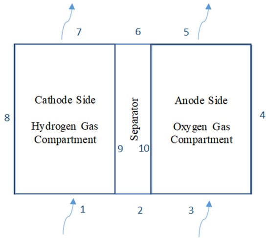 Schematic view of electrolysis cell. The numbers indicate the main cell components and flow ports: (1, 3) electrolyte/reactant inlets, (5, 7) gas outlets, (2, 6) bottom and top manifolds, (4) anode-side compartment wall, (8) cathode-side compartment wall, and (9, 10) separator boundaries. The arrows indicate the inlet flow of electrolyte/water at the bottom of the cell (1–3) and the outlet flow of produced hydrogen and oxygen gases at the top of the cell (7–5).