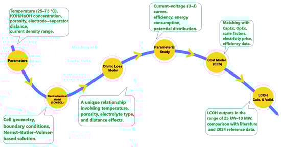 This systematic approach provides a detailed framework for cost optimization in alkaline water electrolyzers and ensures that all relevant factors are comprehensively evaluated. The general flow of the steps followed in the modelling process is summarized in Figure 2.