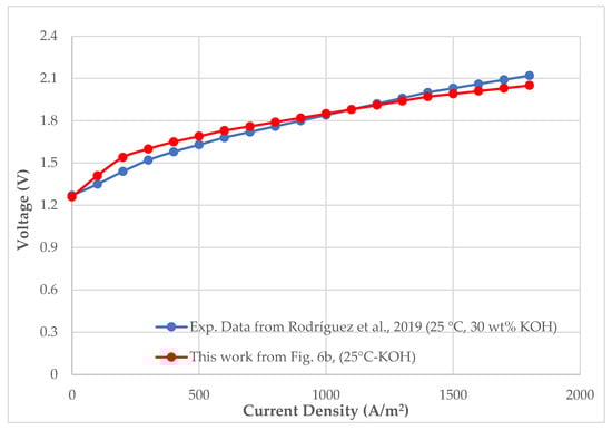 Validation of the electrochemical model against experimental data. The solid red line represents the simulation results of this study (6 M KOH, 25 °C and 2 mm electrode–separator gap). The blue markers represent independent experimental data reported by Rodriguez et al. [69] for an alkaline electrolysis cell (30 wt% KOH, 25 °C).
