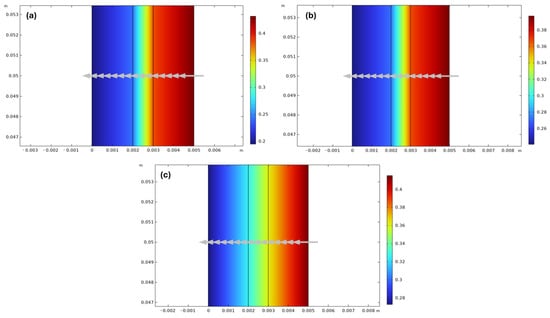 Analysis of the electrolyte potential and current field. (a) Base case (Analysis 1; U = 1.98 V): A regular potential drop across the field and accompanying current paths are observed; when the applied voltage changes, the spatial pattern is preserved, and the drop magnitude and vector intensity are scaled. (b) Temperature scan (Analysis 10; U = 1.98 V and T = 25–75 °C): while the shape of the potential distribution remains essentially constant, the increase in temperature raises the electrolyte conductivity; this leads to a decrease in the ohmic drop and a sharpening of the current vectors (consistent with the I–U sensitivities). (c) High separator porosity configuration (U = 2.03 V): increased porosity enhances the separator’s effective conductivity, causing the red regions to narrow (lower potential drop) and current paths to concentrate; consequently, ohmic losses decrease and cell efficiency improves. The arrows indicate the electrolyte current density, showing the direction and relative magnitude of ion flow.