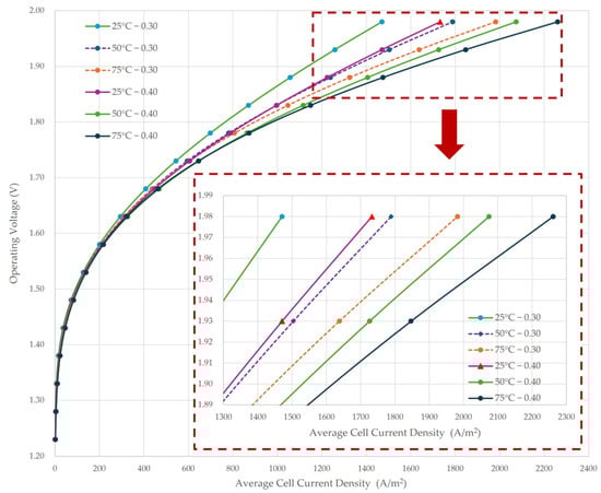 Effect of temperature and separator porosity. The relationship between operating voltage (V) and average cell current density (I) is shown for three temperatures (25, 50 and 75 °C) and two porosities (ε = 0.30; 0.40) (KOH 6 M; electrode–separator distance 2 mm). As temperature and porosity increase, the curves shift downward; lower U is required for the same J (e.g., at U = 1.98 V, I for ε = 0.30 is 25 → 50 → 75 °C; ~1733 → 2074 → 2261 A·m−2 for ε = 0.40). The enlarged panel highlights that small voltage increases in the 1.88–1.98 V band lead to disproportionate increases in I. The trends are consistent with the decrease in ohmic drops resulting from increased ionic/effective conductivity.