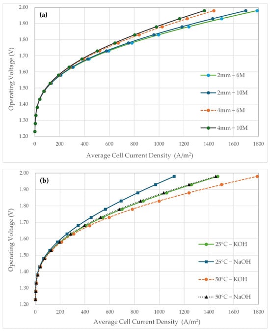 Effects of geometry–concentration (a) and electrolyte–temperature (b): (a) The I–V relationship is shown for KOH at two cell gaps (2 and 4 mm) and two concentrations (6 and 10 M). Increasing the cell gap to 4 mm shifts the curves significantly upward, requiring higher V for the same I; increasing the concentration to 10 M produces a similar but weaker upward shift. (b) Comparison of KOH and NaOH at 25 °C and 50 °C (6 M; electrode–separator distance 2 mm; and porosity 0.30). At 25 °C, the NaOH curve is systematically higher than that of KOH; at 50 °C, both curves shift downward and the difference between them narrows significantly. The findings indicate that a narrow cell gap–medium concentration combination should be preferred to limit ohmic losses, and that electrolyte–temperature co-optimization is desirable for performance.