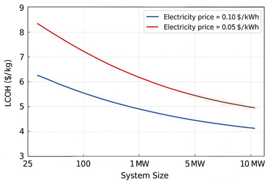 LCOH variation with system scale and electricity price.