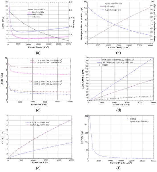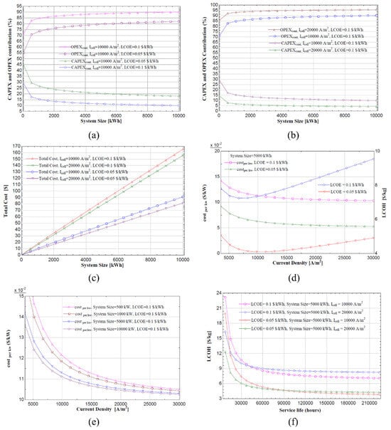 The one-dimensional voltage–current relationships obtained from COMSOL were combined with a cost module developed in the EES environment to optimize the levelized cost of hydrogen (LCOH) for alkaline electrolyzers. The approach is applied to 25, 100, 1000, 5000 and 10,000 kW systems by matching the technical outputs derived from current density, voltage and efficiency with capital and operating costs and incorporating scale effects. The analyses were conducted for two electricity cost scenarios (0.05 $·kWh−1 and 0.10 $·kWh−1) and two current density levels (10,000 and 20,000 A·m−2); in each scenario, CapEx and OpEx were decomposed, lifetime hydrogen production was calculated and LCOH was derived based on this (20 analyses in total).