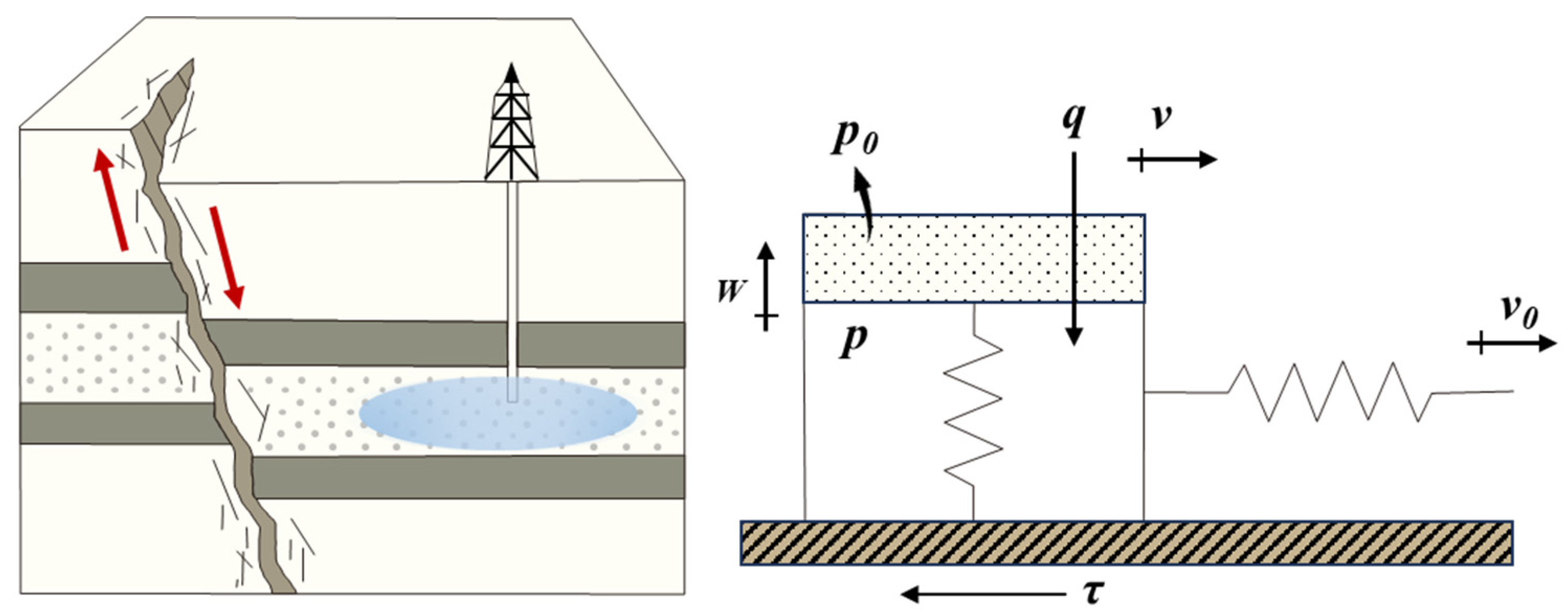 Figure 1). Here, a single-degree-of-freedom spring–slider model is adopted to simulate fault slip under evolving effective stress [