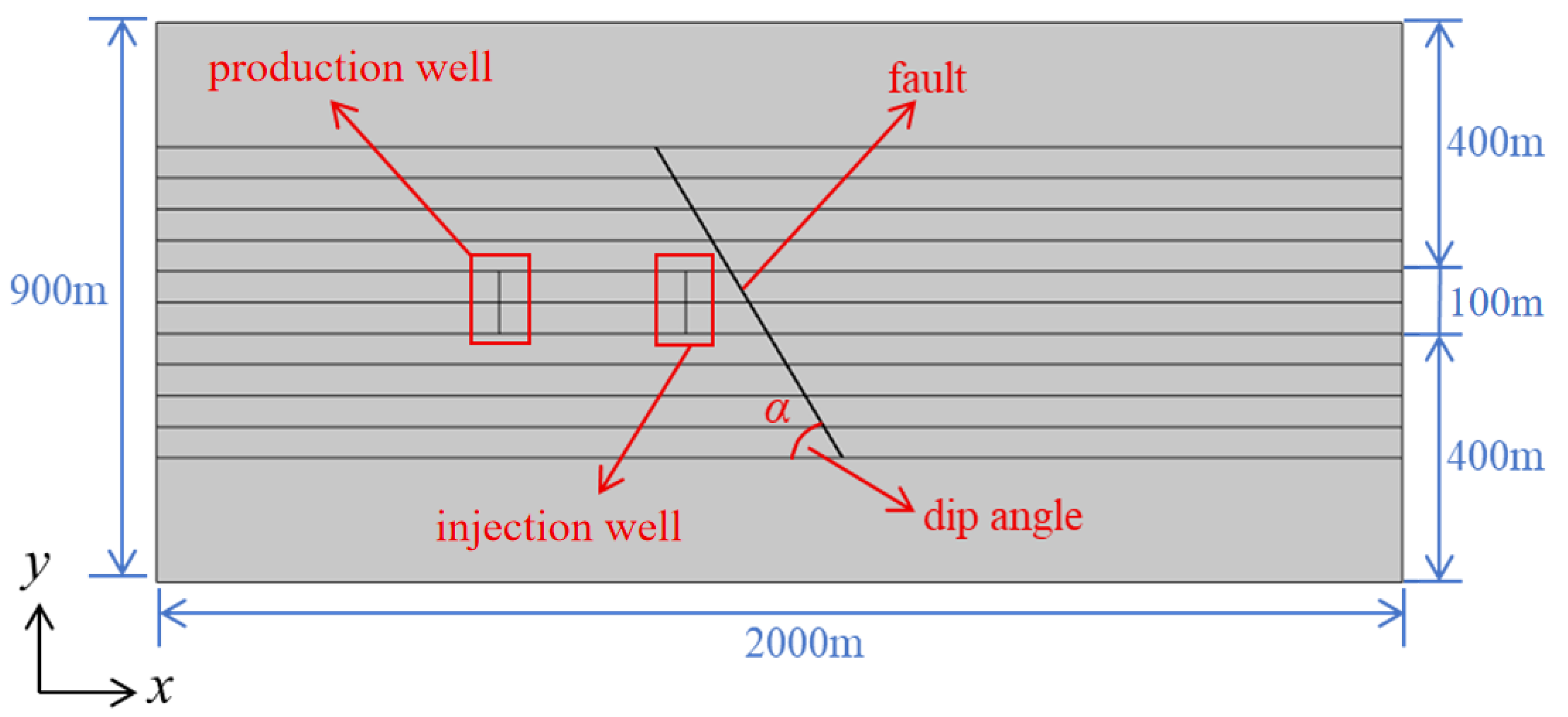 To address these gaps, this study develops an integrated numerical model that couples fluid–solid interaction with rate-and-state friction laws, with the aim of exploring the dynamic processes of injection-induced fault shear slip. Multi-physics finite element simulations are performed using COMSOL Multiphysics (Version 5.4), focusing on the combined effects of injection–production rate, operational scheme, well placement, reservoir permeability, and fault dip angle on the evolution of fluid pressure, effective stress, shear stress, CFS, and critical stiffness within the fault core. Through systematic parameter investigations, this study seeks to identify the primary factors governing fault slip behavior and stability, thereby providing more reliable theoretical foundations and quantitative tools for seismic risk assessment and the optimization of oilfield operations.