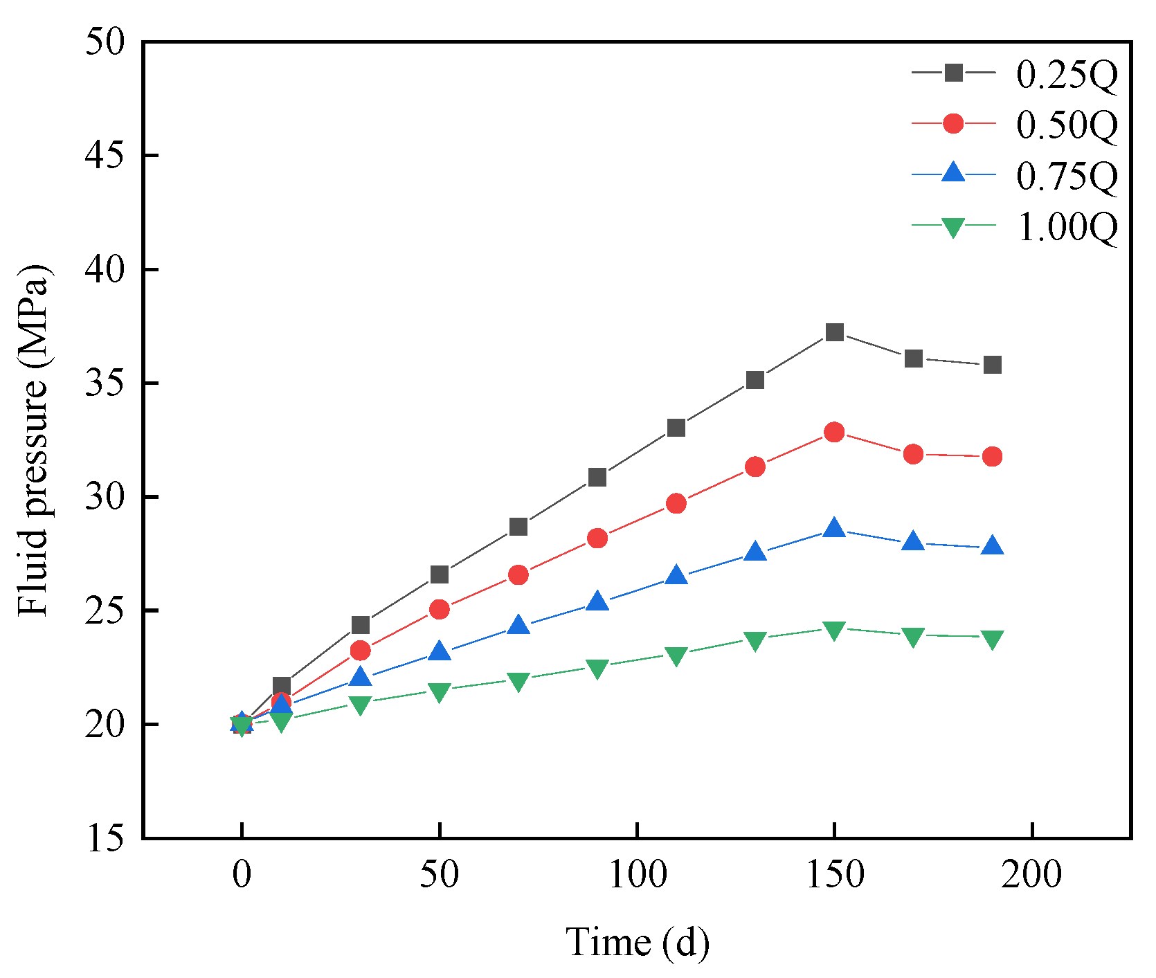 Temporal variation of pore pressure in the fault core under different injection and production flow rates.