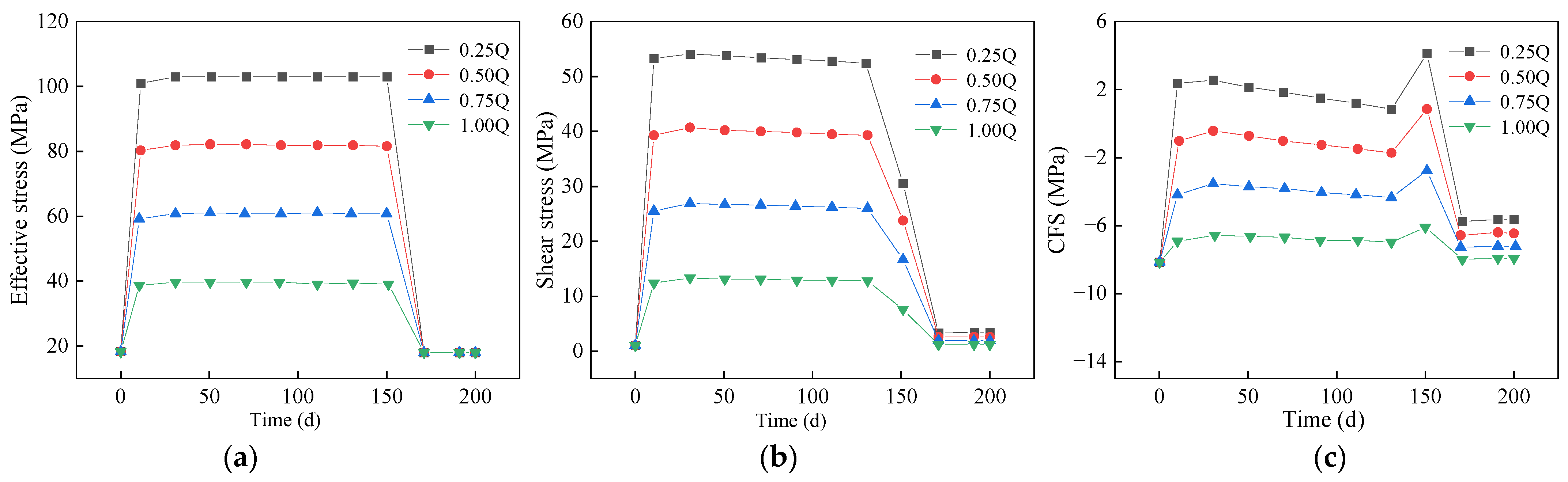 Temporal variations of (a) effective stress, (b) shear stress, and (c) CFS in the fault core under different injection–production flow rates.