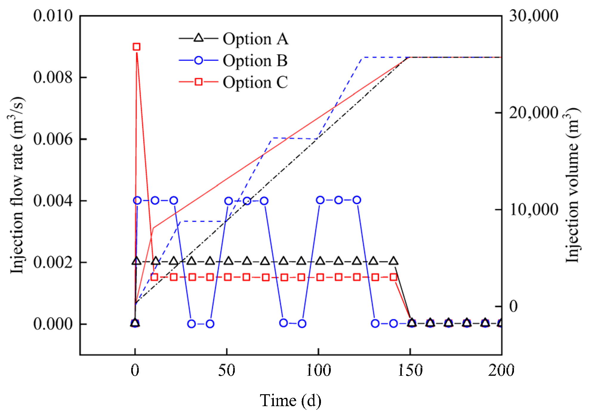 Cumulative injection volume versus time under different injection schedules.
