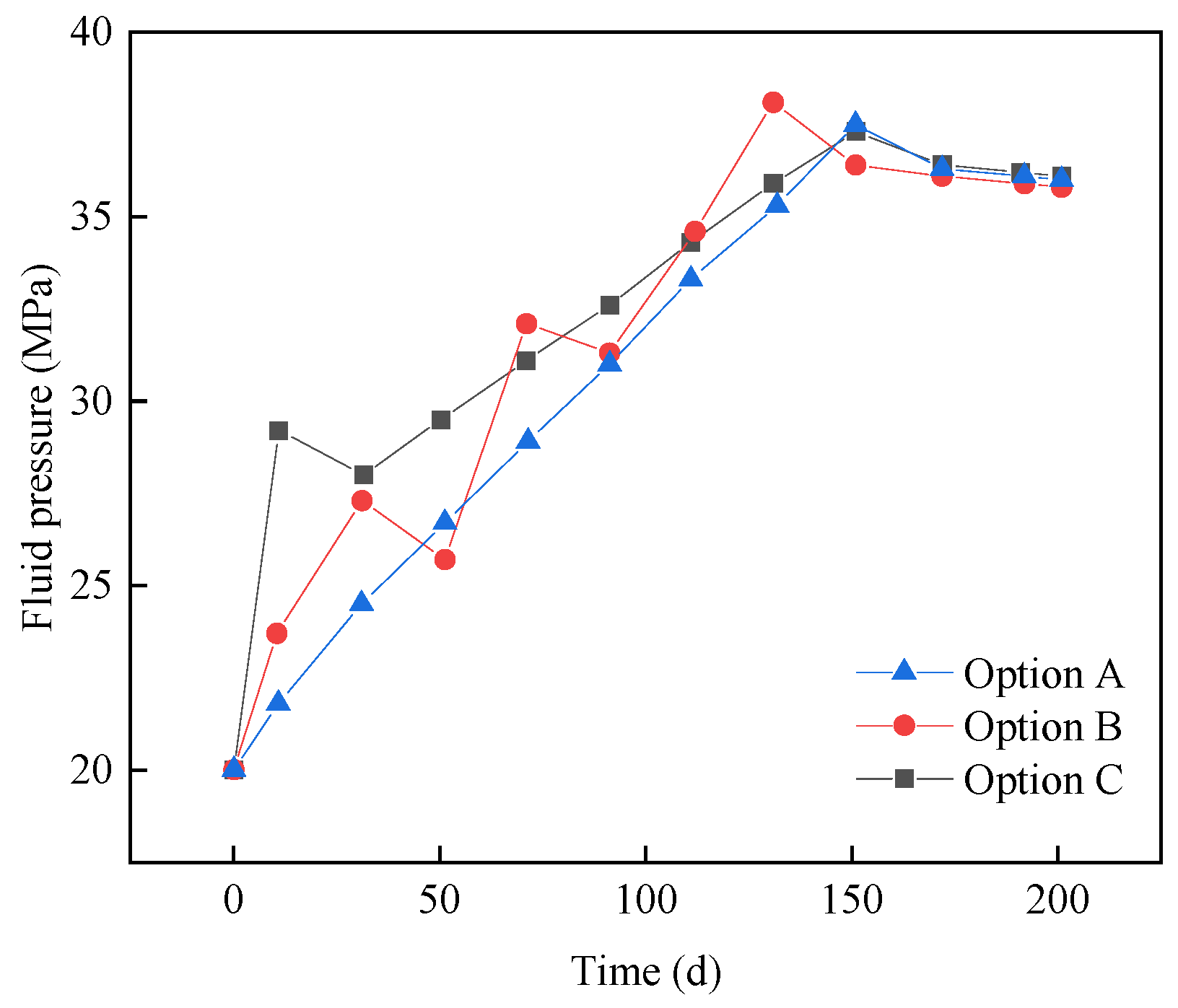Temporal variation of pore pressure in the fault core under different injection schedules.
