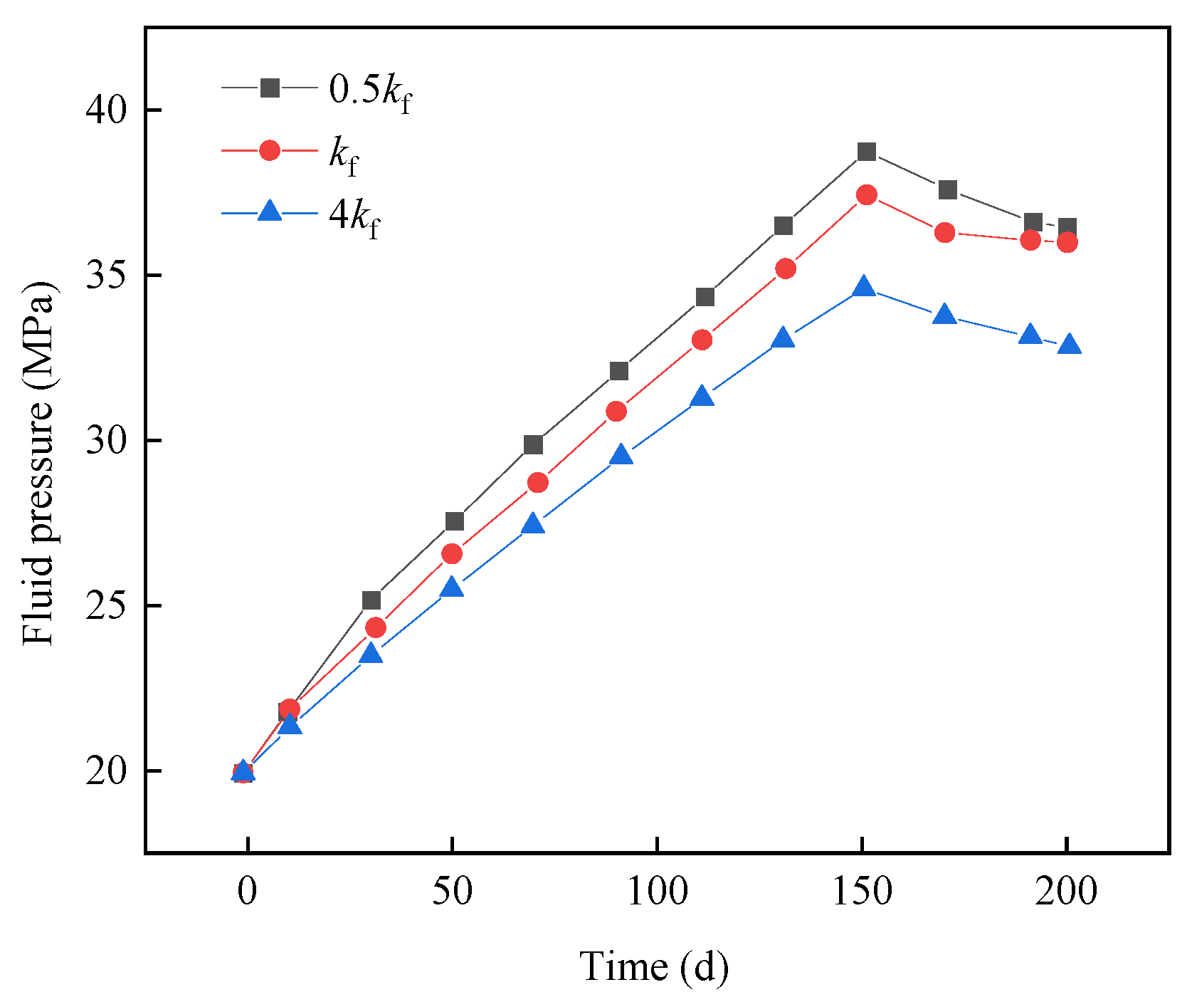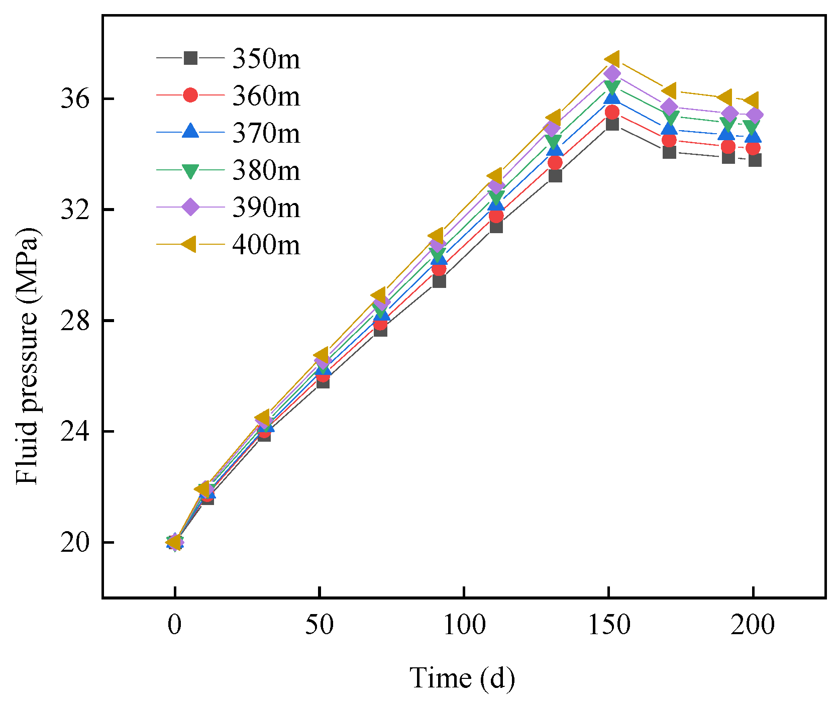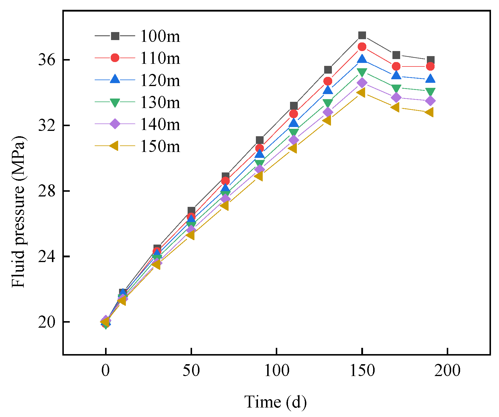 Fluid pressure in the middle part of the fault core under different water injection well locations.