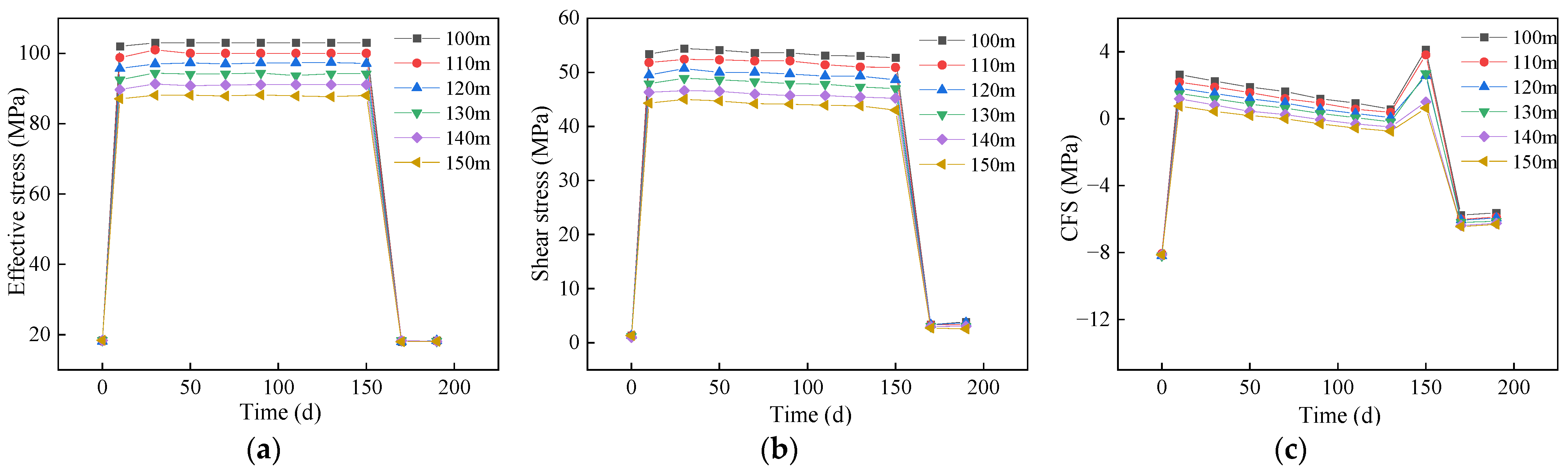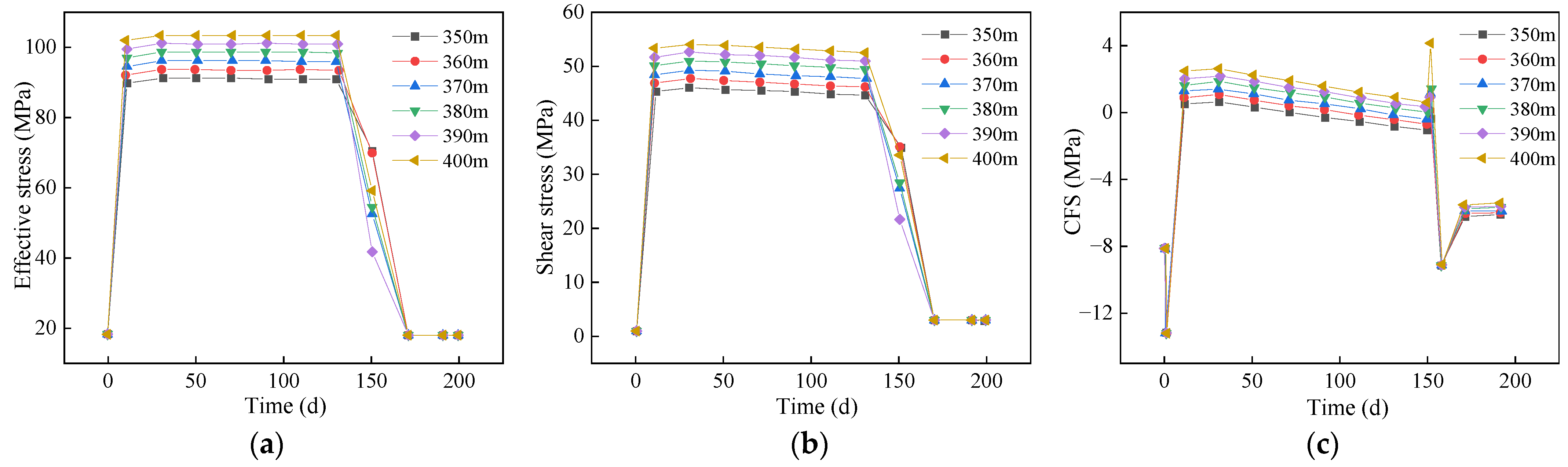 Figure 19b) exhibits a similar three-stage evolution. Larger dip angles lead to faster shear stress buildup, reflecting stronger compression effects. In contrast, during the slow-decline stage, smaller dip angles show more rapid shear stress reduction, indicating that production wells exert a stronger influence on the fault core of shallow-dipping faults.